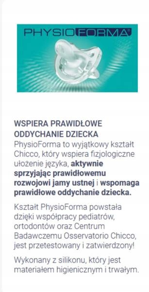 ✓ PhysioForma — это уникальная форма всех пустышек Chicco, которая поддерживает правильное положение языка. Благодаря этому он поддерживает физиологическое дыхание и правильное развитие ротовой полости ребенка.