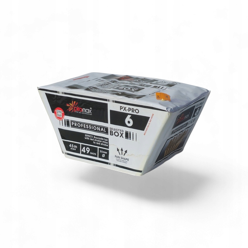 PX-PRO 6 — впечатляющий фейерверк класса F3, который обеспечит зрелищное пиротехническое шоу в новогоднюю ночь. Этот продукт Piromax предлагает 49 впечатляющих снимков профессиональным калибром 30 мм, достигающими высоты до 45 метров.