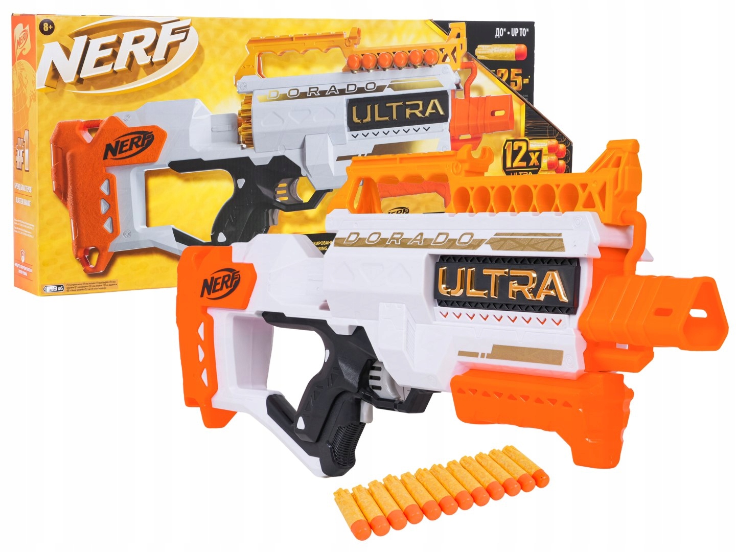 Полуавтоматический пистолет NERF Ultra DORADO со дротиками для детей от восьми лет. Пистолет питается от 6 батареек типа АА 1,5 В (в комплект не входят). Имеет открытый барабан для дротиков, вмещающий 6 пенопластовых пуль. Вам нужно зарядить барабан стрелами, зажать кнопку ускорения и нажать на спусковой крючок. Пули могут лететь на расстояние до 25 метров. Они имеют особую инновационную форму, увеличены точность и дальность стрельбы. Они отделаны резиной, что повышает безопасность выстрела. Пистолет имеет специальное окно для извлечения застрявших дротиков.