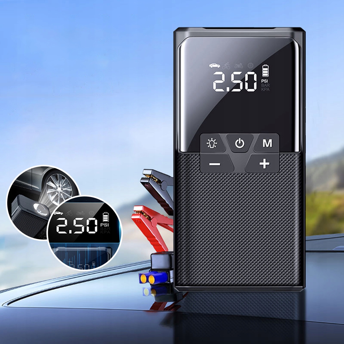 Аварийное освещение и зарядка. Этот портативный воздушный компрессор — это больше, чем просто насос для накачивания шин; это также многофункциональный аварийный инструмент. Фонарик наверху имеет три режима (фонарик, SOS и стробоскоп) и помогает накачивать, менять шины или подавать сигнал другим транспортным средствам в ночное время. Оснащенный портами USB-C и USB, он служит источником аварийного питания для мобильных телефонов и других электронных устройств.