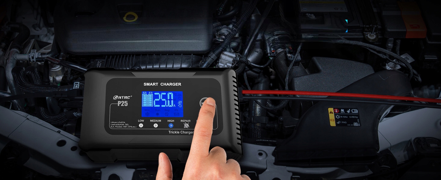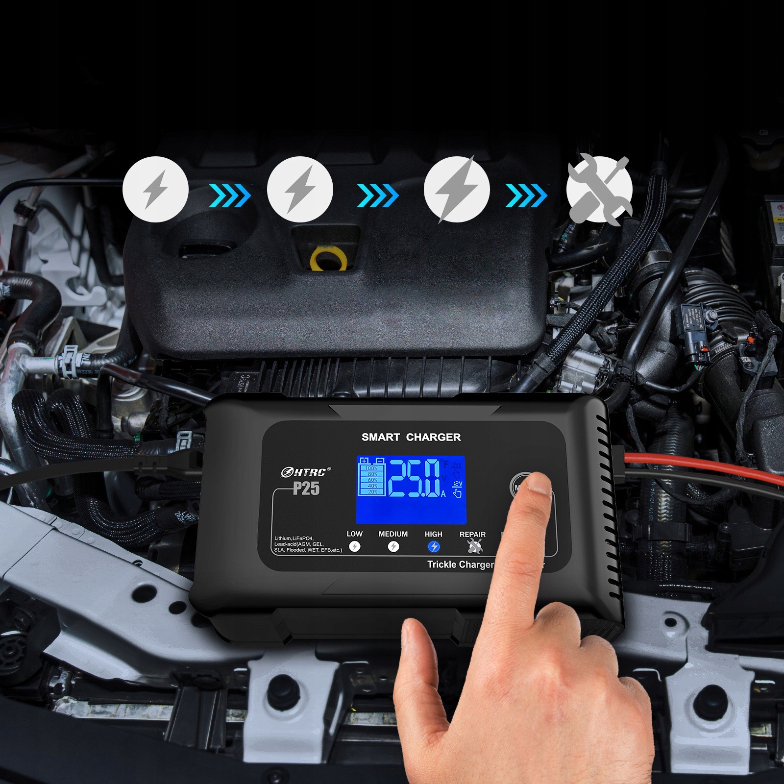 🚤🚲🚙【Запуск одной кнопкой】Зарядное устройство для аккумуляторов 12 В, 25 А, 24 В, 13 А с четырьмя режимами запуска одной кнопкой. Максимальный зарядный ток составляет 25 А, что позволяет быстро зарядить аккумулятор. Использование пружинных кнопок вместо сенсорных значительно продлевает срок службы зарядного устройства.