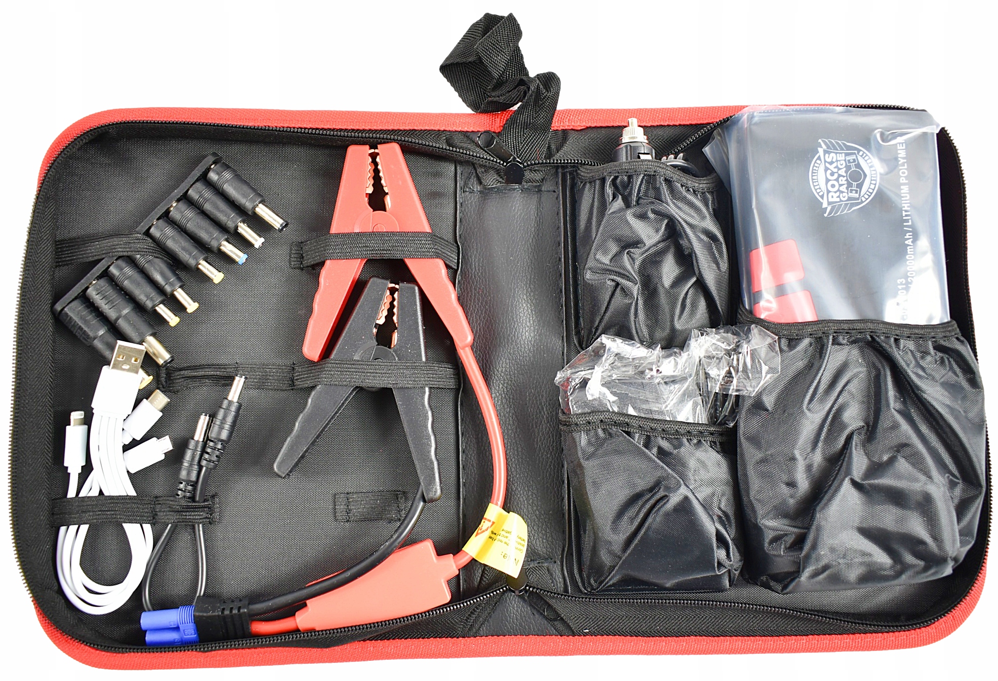 - Комплект упакован в практичный и прочный кейс со всеми аксессуарами: кабели для ноутбука и планшета, кабели для смартфонов (iPhone, разъем Micro USB, Mini USB). , USB-C), сетевое зарядное устройство 230 В, автомобильное зарядное устройство 12 В, соединительные кабели с защитой.