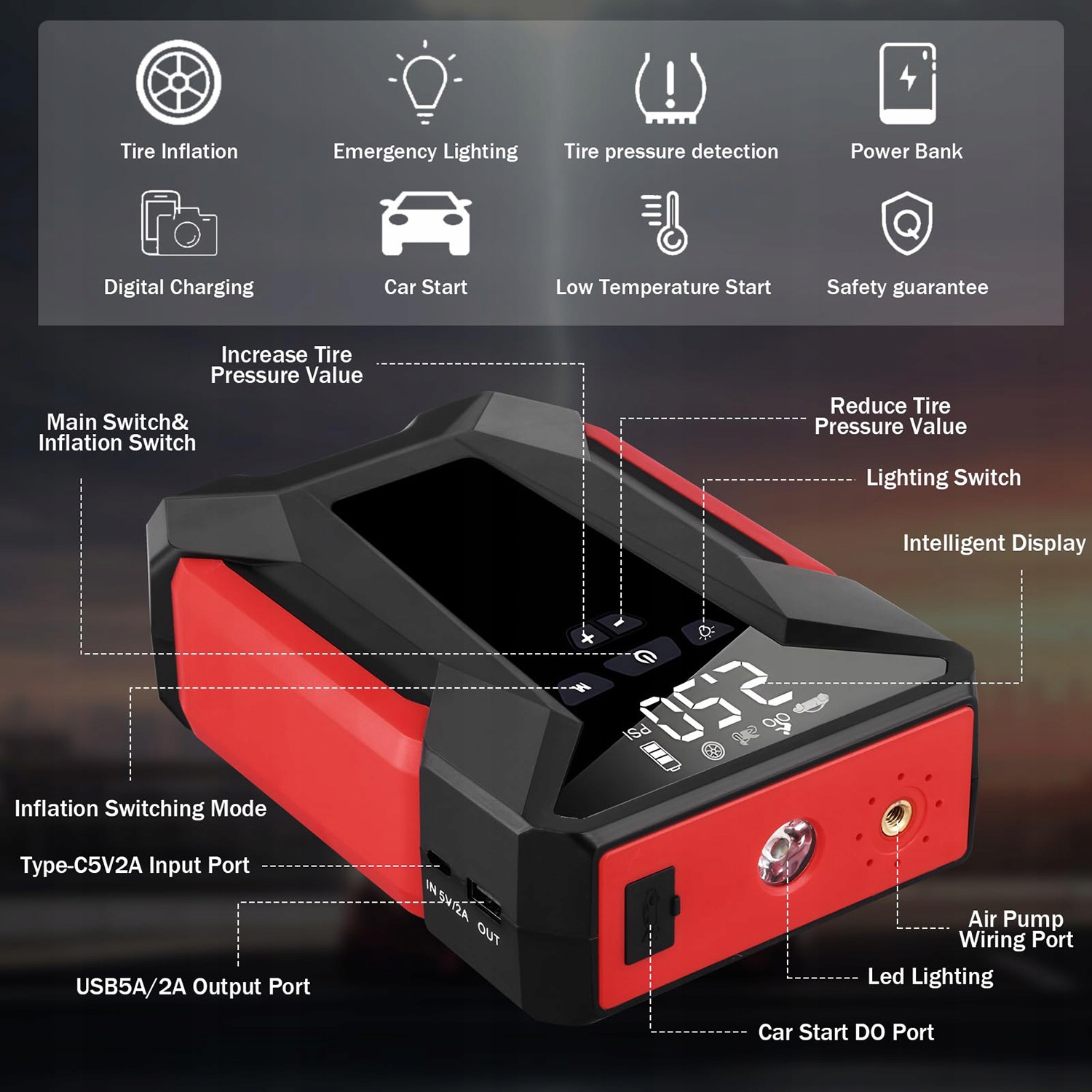 【Многофункциональная конструкция】 Практический стартер автомобиля не только позволяет быстро запустить двигатель, но также может использоваться в качестве воздушного насоса, монитора давления в шинах, электростанции или светодиодного света. Запустите автомобиль с напряжением 12,0 В и запустите бензиновые двигатели с емкостью до 5,0 литров или 3,0 -литровыми дизельными двигателями.