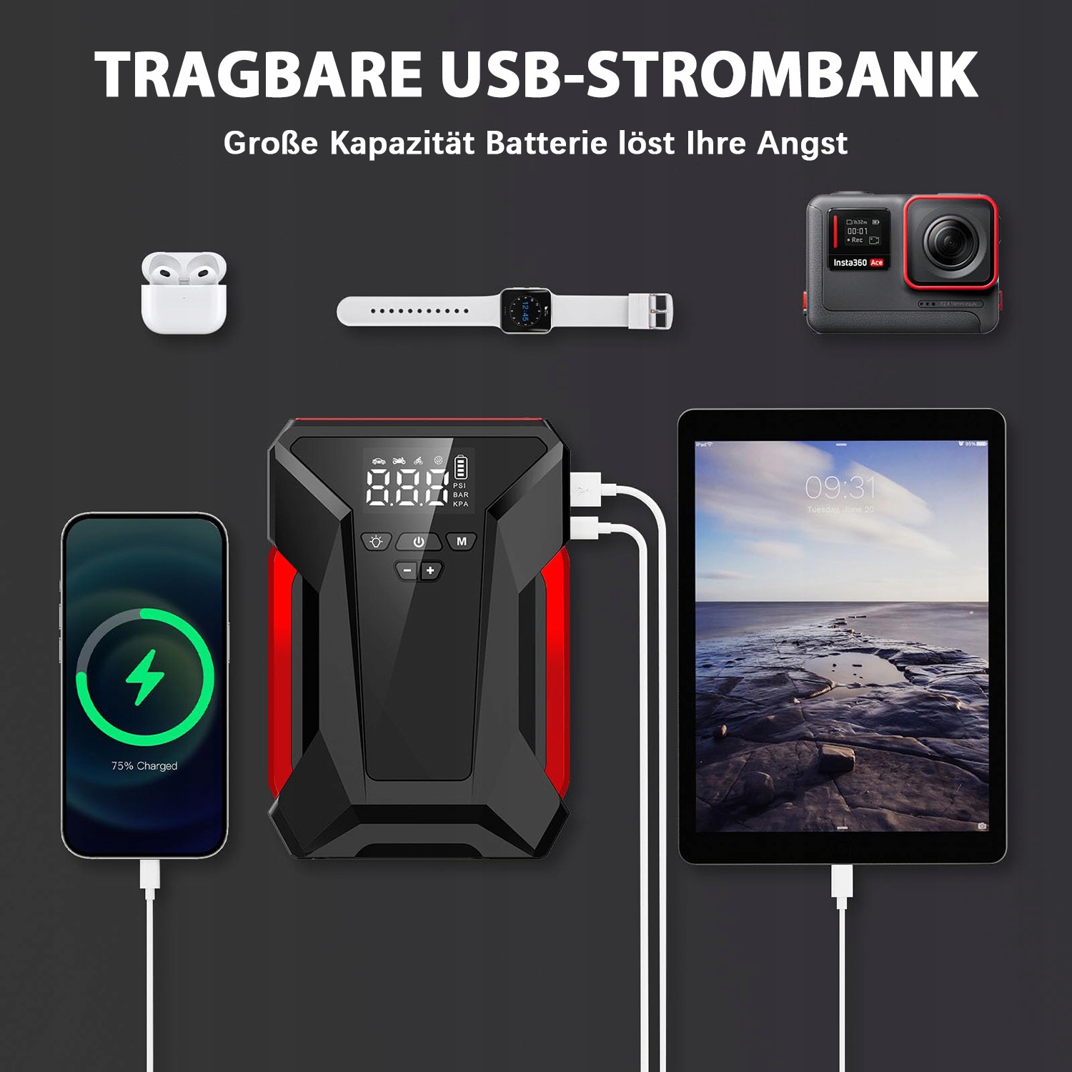 【воздушный компрессор】 его можно использовать в качестве электрического воздушного насоса с множеством форсунок для легко накачать автомобиль/мотоцикл/велосипедные шины, шарики, плавающие колеса и многие другие. Он поддерживает давление в шинах и автоматически останавливается, когда шины заполнены.