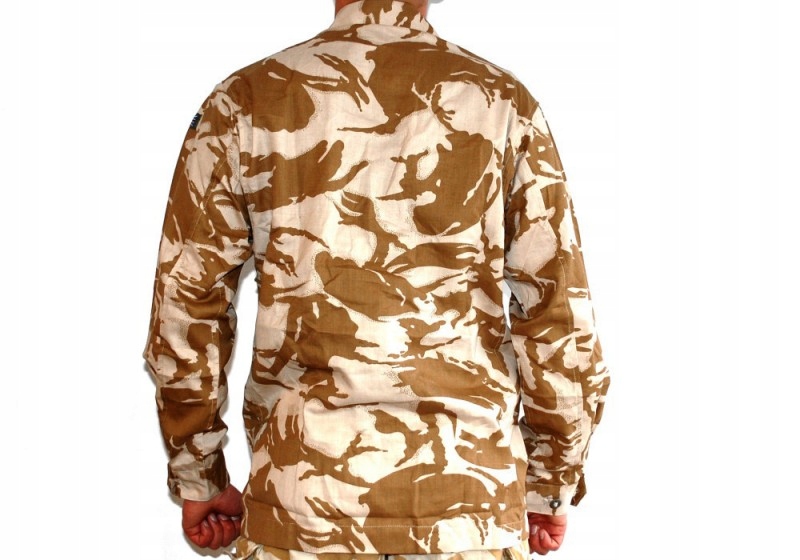 Оригинальная, контрактная толстовка, рубашка британской армии в камуфляже пустыни. Закреплена канадской кнопкой и военным тоном. Манжеты в рукавах регулируются кнопками. Рубашка проста, все закрепленные канадскими пуговицами. Воротник свернут с возможностью закрепления под шеей (видимо, на фотографии).
