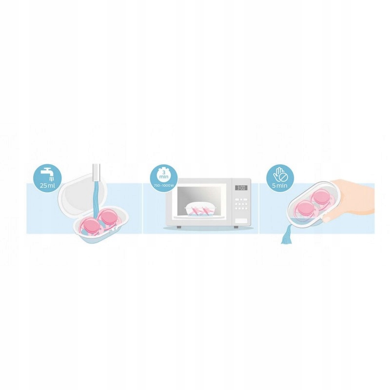 - Дорожный футляр для пустышки Ultra Air также служит стерилизатором, поэтому все, что вам нужно сделать, это добавить немного воды и поставить ее в микроволновую печь. После такой обработки вы можете быть уверены, что соска чистая и готова к повторному использованию.