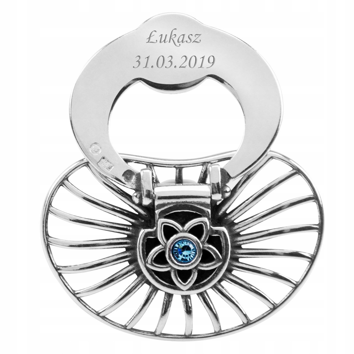 Соска серебряная с голубым камнем на крещение Гравировка