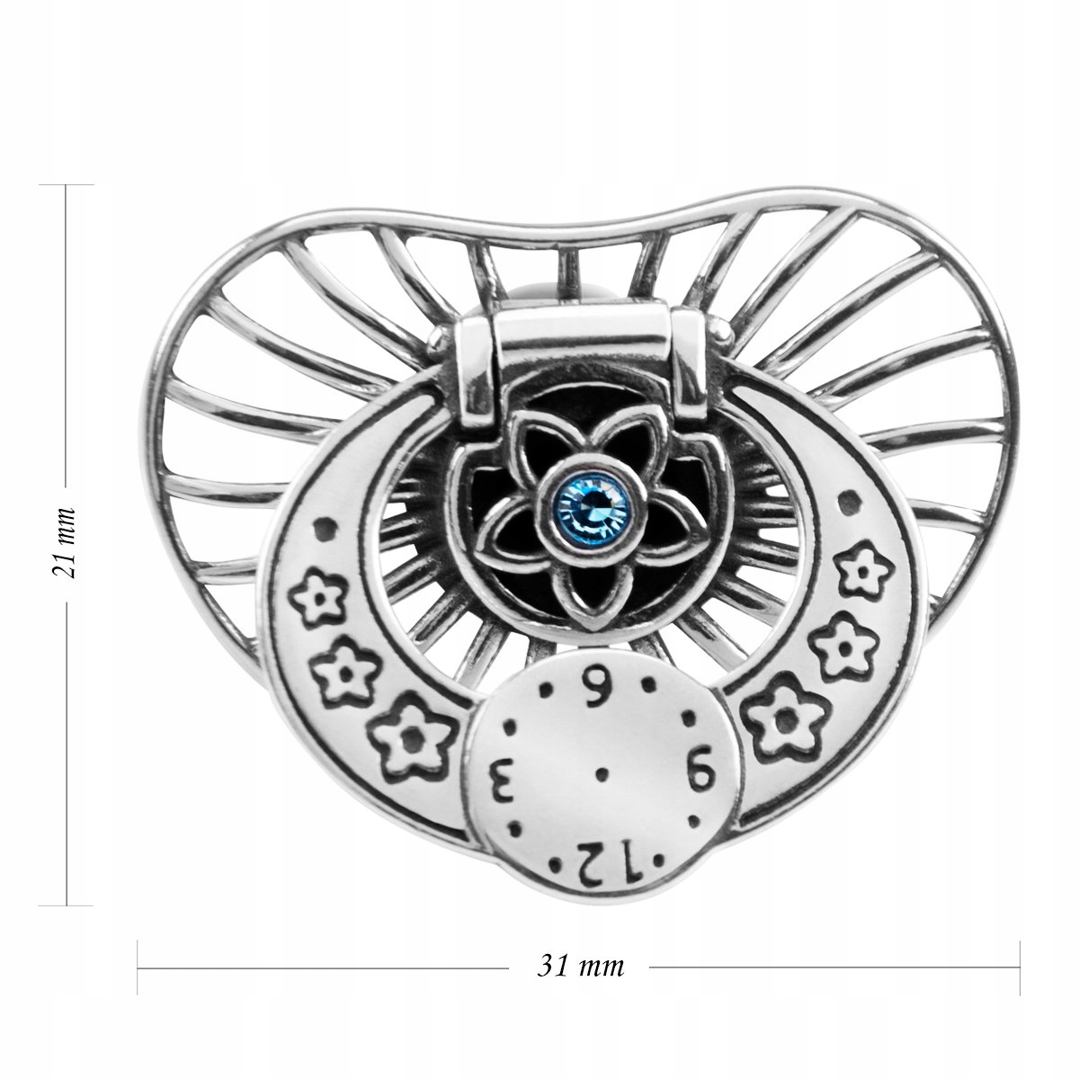 Предлагаем Вам красивую серебряную соску с голубым камнем. Есть представляет собой отделение в соске с «клапаном» для первого зуба. Красиво оформленные изделия цирконами, листьями и цветами.