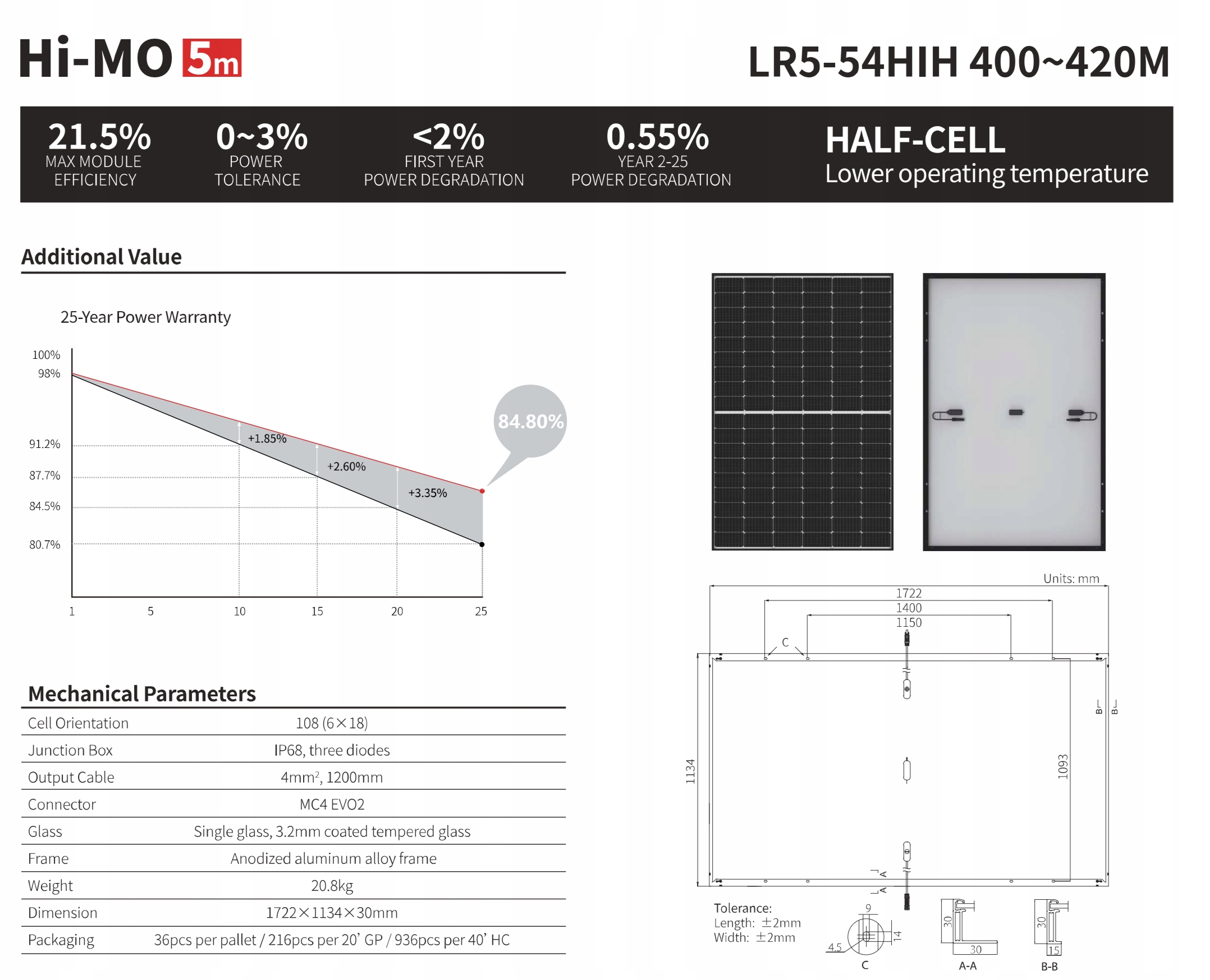 Высокая мощность 405 Вт, технология HPBC, высокая эффективность и 25-летняя история. сделайте ее премиальной панелью для самых требовательных установок.