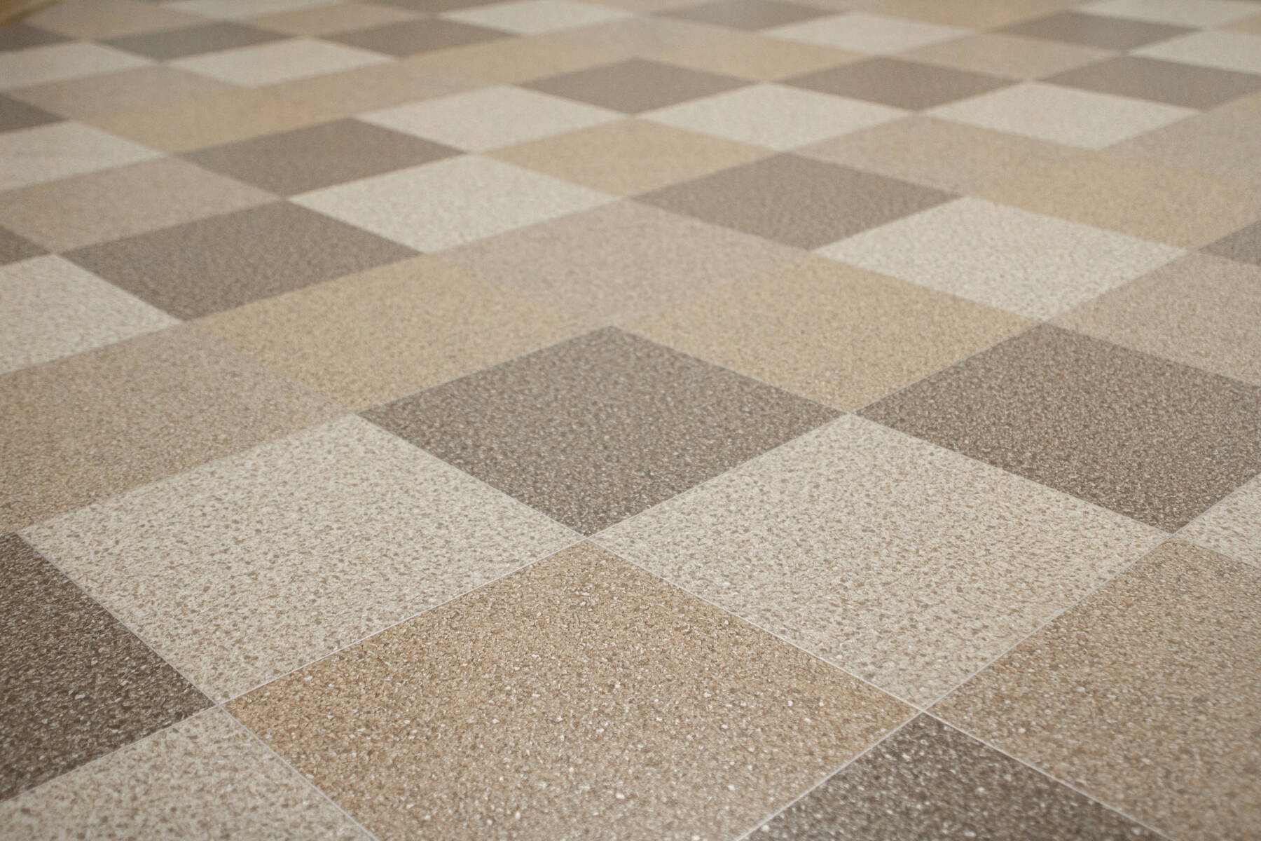 PVC Actual Plus Ice Diamond 7193 с рисунком, имитирующей пол из квадратной керамической плитки, расположенной в Каро, в оттенках бежевого, крема, бонга и серебра.