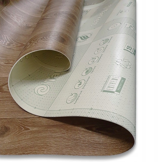 Эластичный коврик с рисунком, имитирующим деревянные панели. Пол изготовлен из поливинилхлорида, также известного как ПВХ. Это ковер, предназначенный для домашнего использования. Толщина предлагаемого ковра 2,7 мм и слой износа 0,2 мм, предназначен для жилых помещений со средней проходимостью. Прочный - устойчивый к вмятинам и перегибам и УФ-лучам.