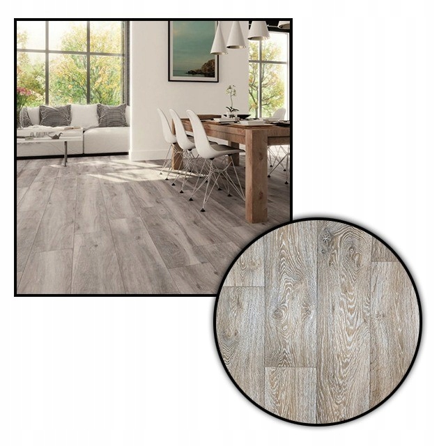 Гибкий ковер с рисунком, имитирующим деревянные панели с ярко выраженной текстурой бежевого, серого и коричневого цветов. Ковер изготовлен из поливинилхлорида, также известного как ПВХ. Это ковер, предназначенный для домашнего использования. Толщина предлагаемого ковролина 2,0 мм и слоя износа 0,15 мм, предназначена для жилых помещений со средней интенсивностью движения. Устойчив к вмятинам, изломам и УФ-лучам.