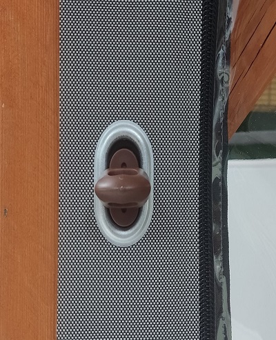 Свободновисящие рулонные шторы из ПВХ-пленки в сочетании с сеткой. Ролеты крепятся на деревянную планку с помощью винтов-бабочек и дополнительно оснащаются струнным механизмом. В состав механизма входят люверсы, направляющие тетиву, и запирающий механизм.
