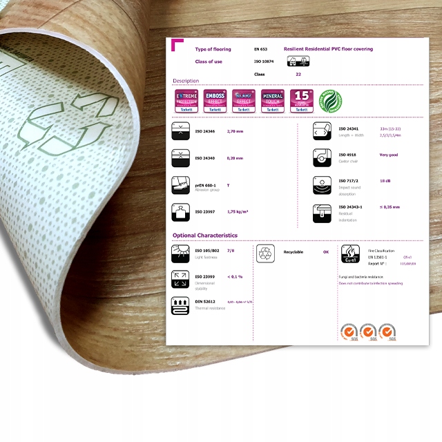 Эластичный коврик с рисунком, имитирующим деревянные панели. Пол изготовлен из поливинилхлорида, также известного как ПВХ. Это ковер, предназначенный для домашнего использования. Толщина предлагаемого ковролина 2,7 мм и слой износа 0,2 мм, предназначен для жилых помещений со средней проходимостью. Прочный - устойчив к вмятинам и перегибам, а также УФ-лучам.