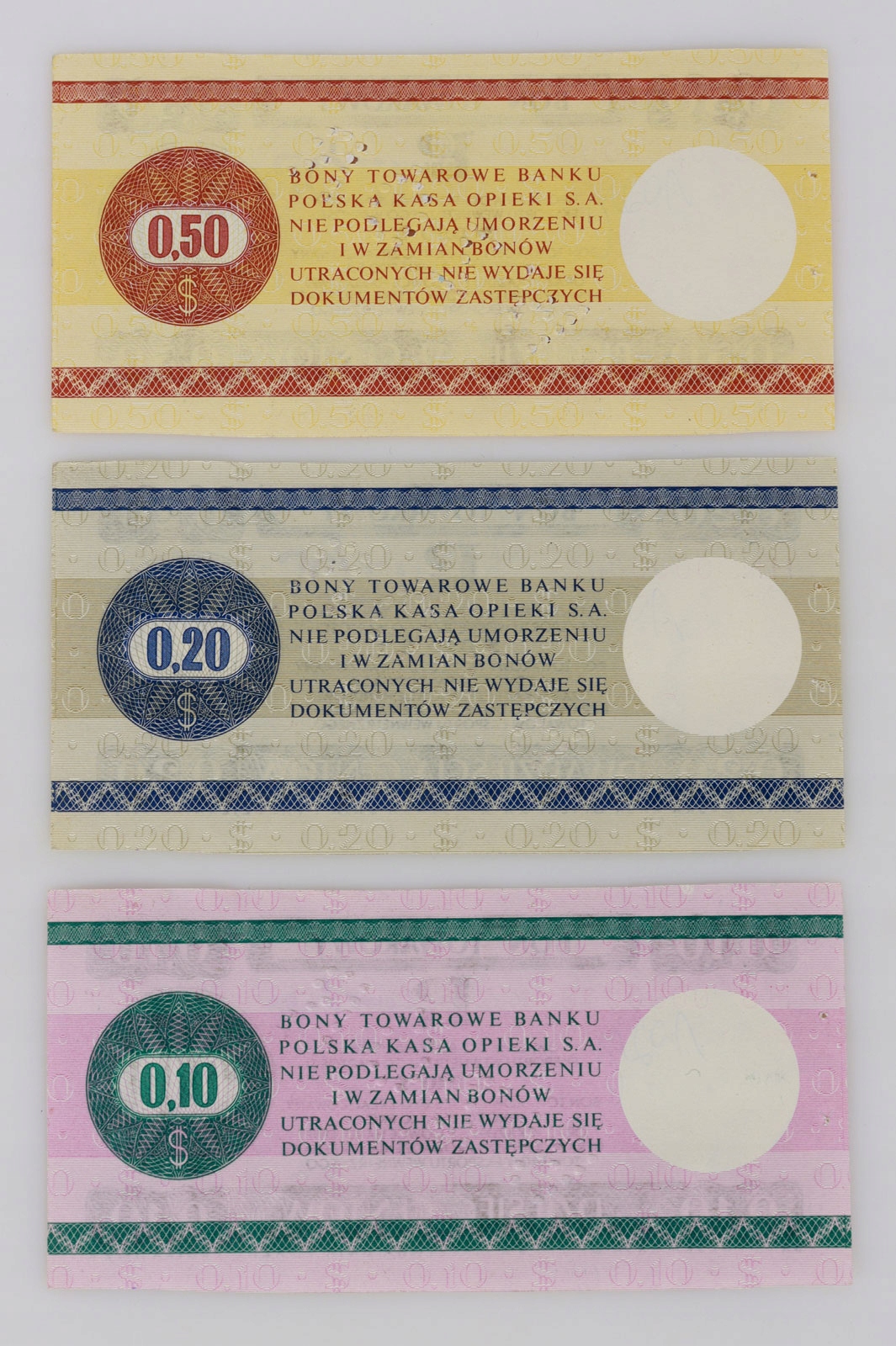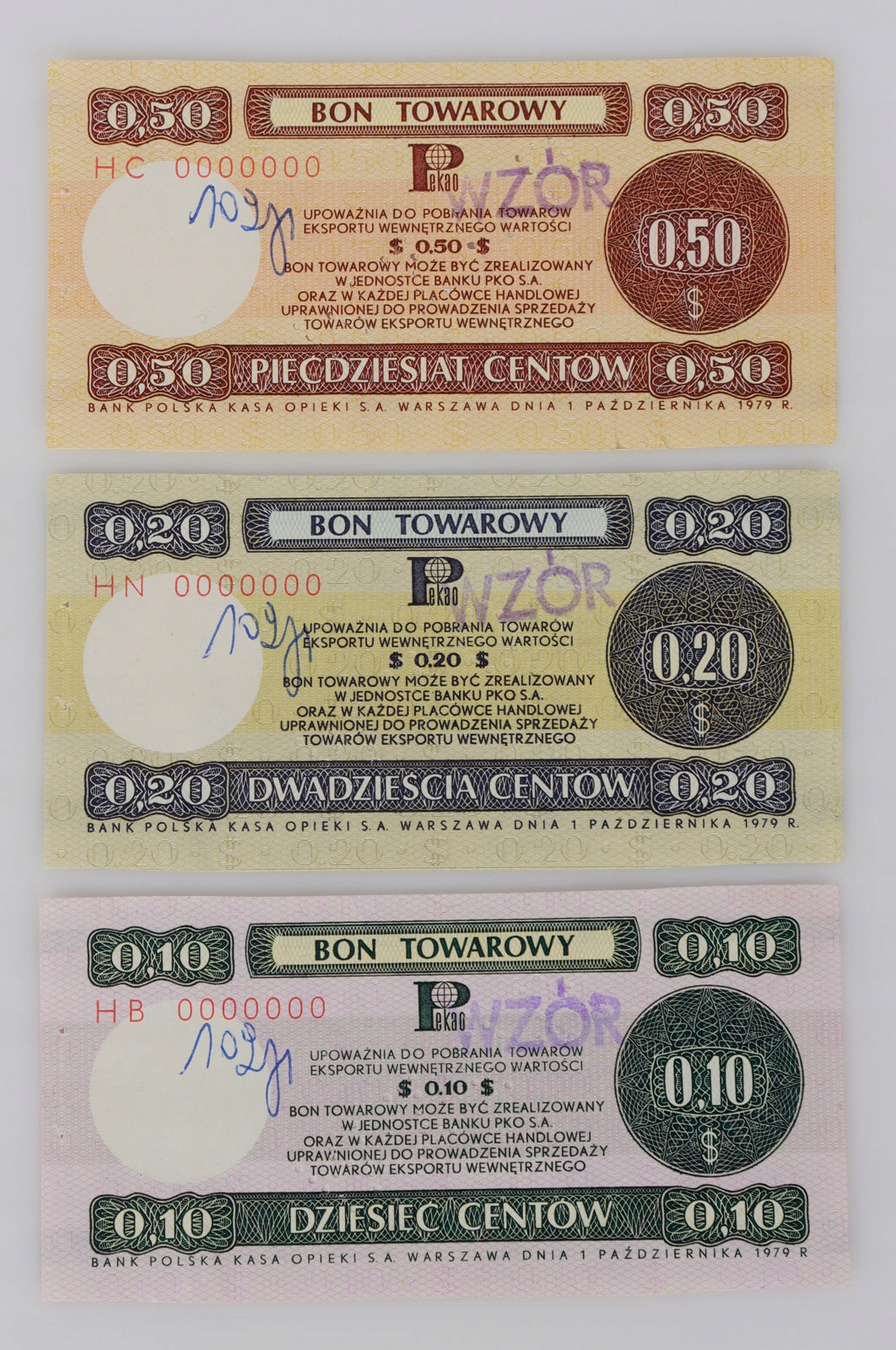 ваучеры PKO с деноминацией 10, 20, 50 центов и 5 и 100 долларов. все ваучеры с нулевой нумерацией, штампом и перфорацией "шаблона". Типичные функции на ваучерах - отверстия после зажима на левом поле. Эмиссия 1979 года.