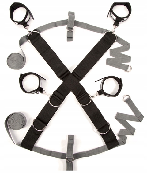 Он состоит из нескольких ремней, которые мы расстегиваем на кровати, создавая таким образом основу для надевания наручников на партнера.