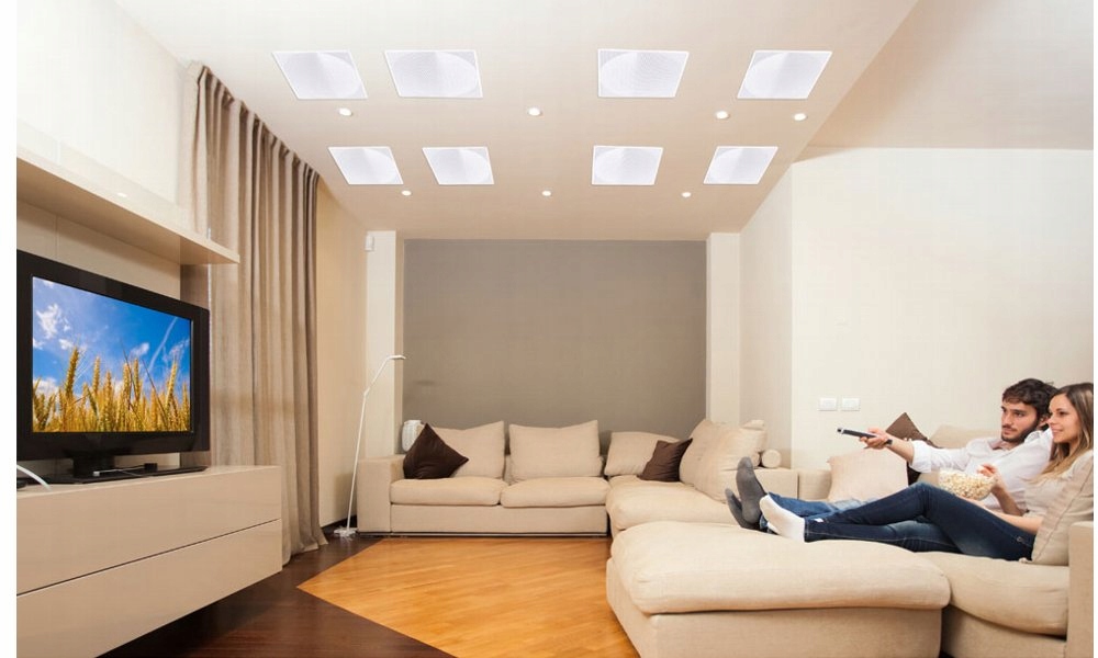 В средних помещениях отлично подойдет потолочная установка с двумя или четырьмя низковольтными громкоговорителями, которые можно легко запитать от любого усилителя.