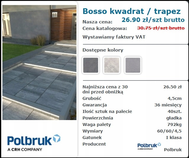 Просматривая «PŁYTA TARASOWA CHODNIKOWA BOSSO 60x60x4 cm POLBRUK PŁYTY TARASOWE HIT!», вы можете быть уверены, что данный товар из каталога «[rubrica_name]» будет доставлен из Польши и проверен на целостность. В цене товара, указанной на сайте, учтена доставка из Польши. Внимание!!! Товары для Евросоюза, согласно законодательству стран Евросоюза, могут отличаться упаковкой или наполнением.