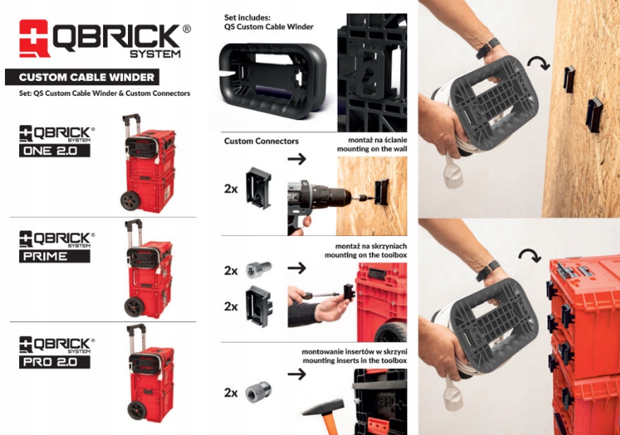 Кабельная намотка Qbrick System может использоваться во многих областях. Идеально подходит для мастерских, гаражей, строительных площадок и садов. Незаменим при всех видах электромонтажных, ремонтных и монтажных работ. Универсальность делает его отличным выбором как для профессионалов, так и для любителей DIY.