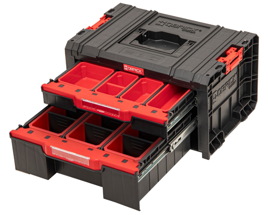 Qbrick System PRO Drawer 2 Toolbox Expert — это вместительный модульный ящик для инструментов, оснащенный двумя выдвижными ящиками на металлических направляющих и удобной кнопкой, обеспечивающей легкий доступ к их содержимому.