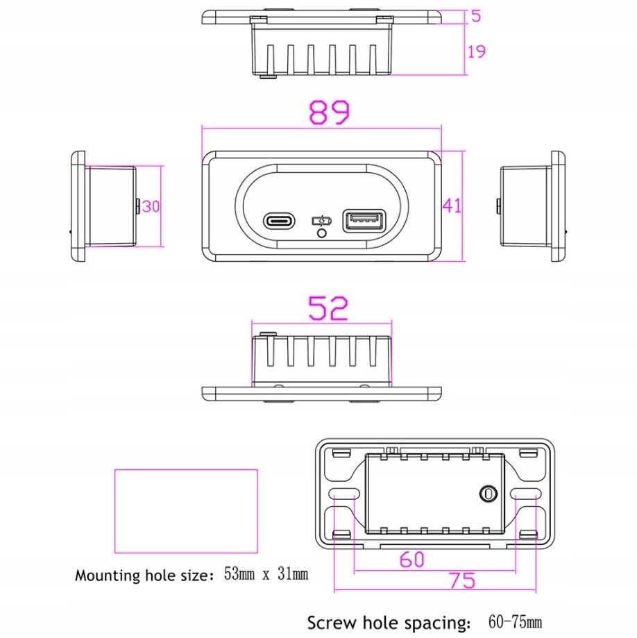 4. Устройство можно установить на плоскую поверхность. Оно широко подходит для большинства транспортных средств 12 В/24 В, автомобилей, мотоциклов, лодок, кемперов. Вход: 12–24 В, выход: 5 В, 4,8 А, синий свет всегда горит при включении питания.
