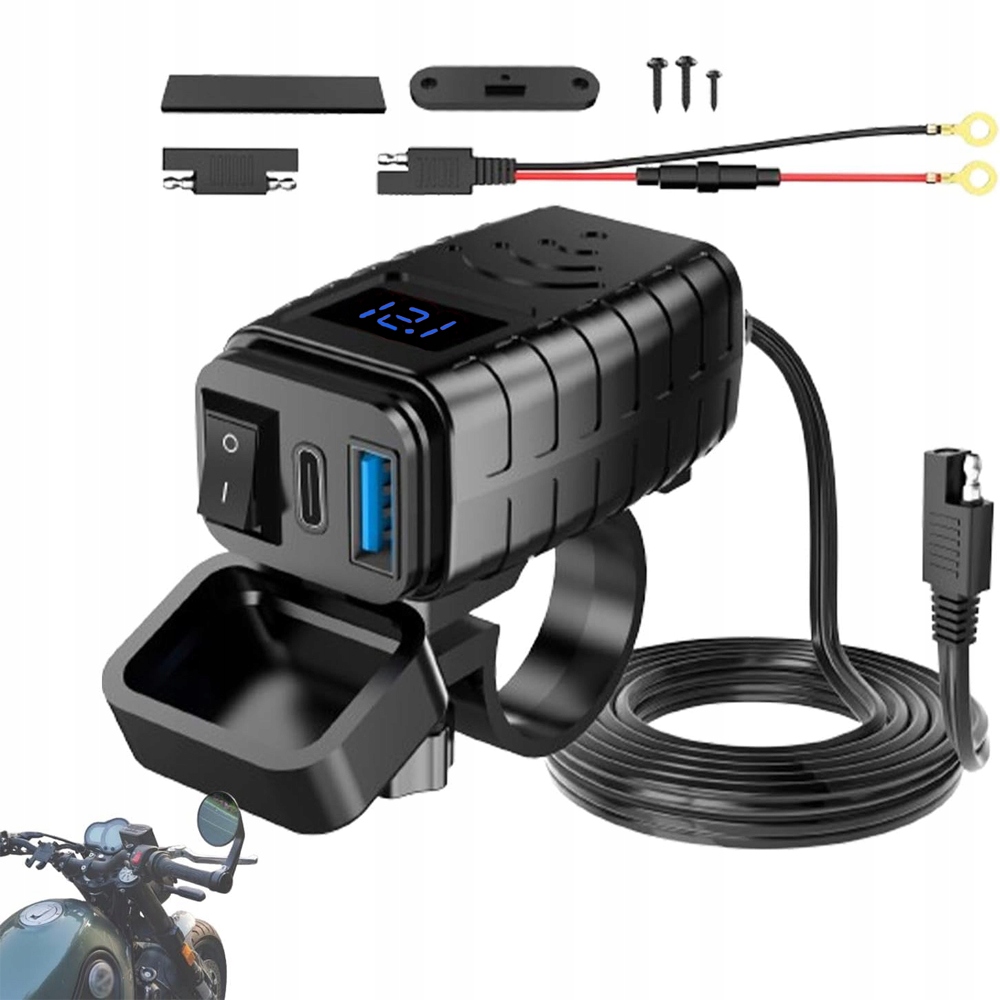 ВОДОНЕПРОНИЦАЕМОЕ ЗАРЯДНОЕ УСТРОЙСТВО USB + USB-C С БЫСТРОЙ ЗАРЯДКОЙ ДЛЯ МОТОЦИКЛА/СКУТЕРА QC 3.0 + ВОЛЬТМЕТР