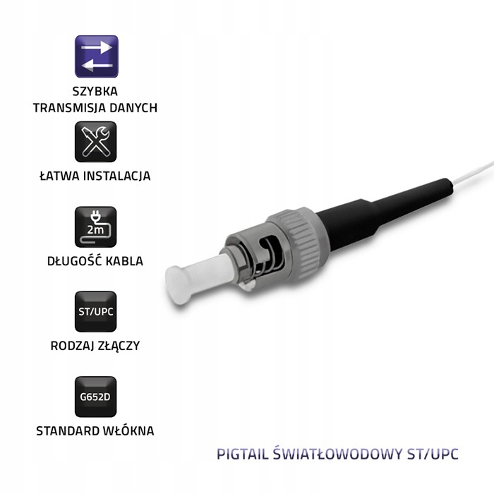 Волоконно -оптический косичка предназначен для подключения распределительных кабелей в переключателях и в одностороннем порядке завершена с разъемом ST/UPC. Он характеризуется низким ослаблением и легкой установкой и работой волокна, а также высокой скоростью передачи данных. В косичке использовались однопроизводительное волокно G652D и внешнее необычное покрытие кабеля, которое не высвобождает вредные газы (LSH) во время пожара. Сигнал в одноммодном волокне не отвлекает, и поток данных отправляется параллельно оси и достигает волокна в одной моде без отражений. Оптические оптические волокны с одним модом являются идеальным решением для оптоволоконной связи на больших расстояниях, поскольку сигнал может транслироваться без какого -либо усиления до 100 км.