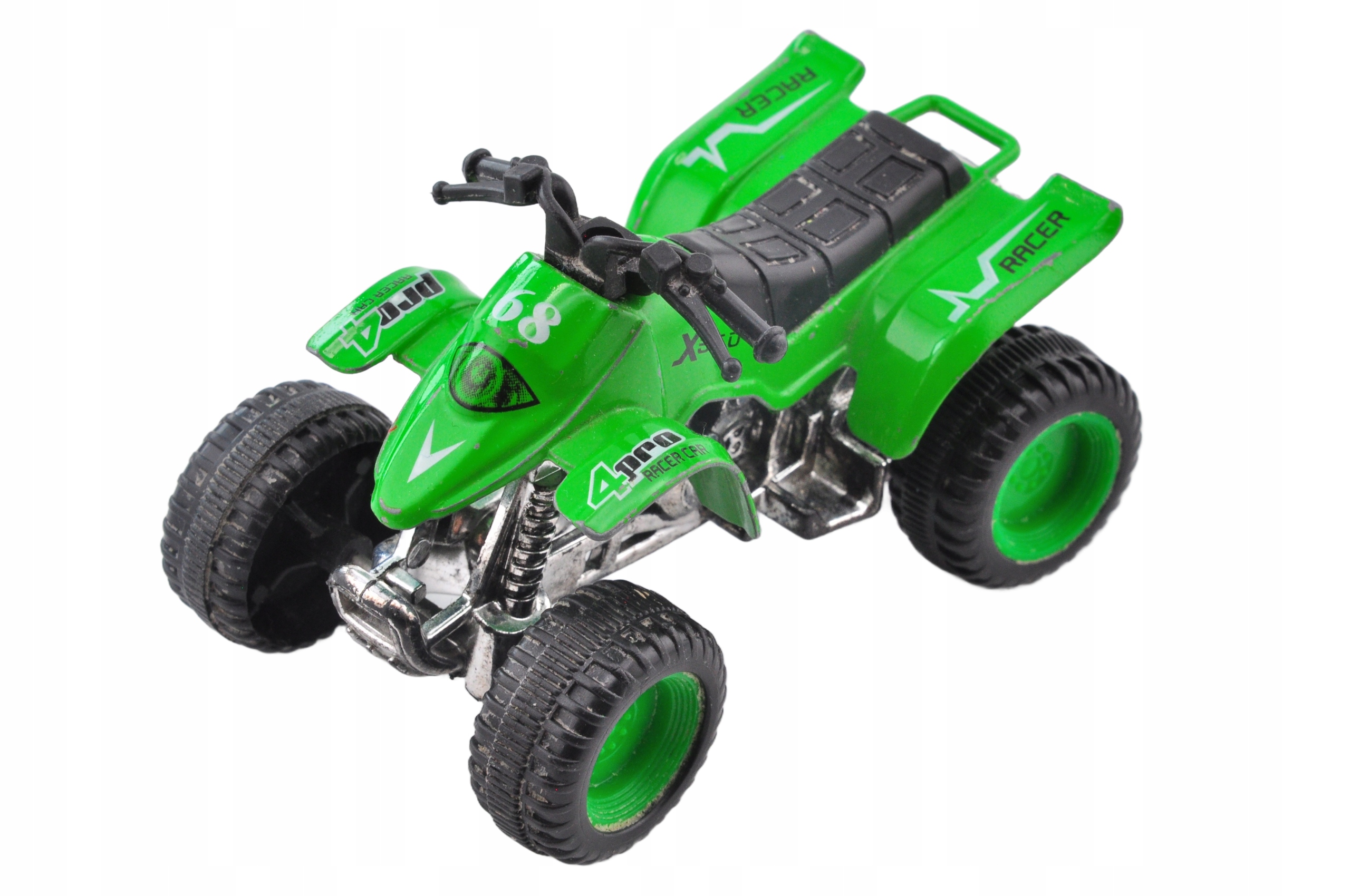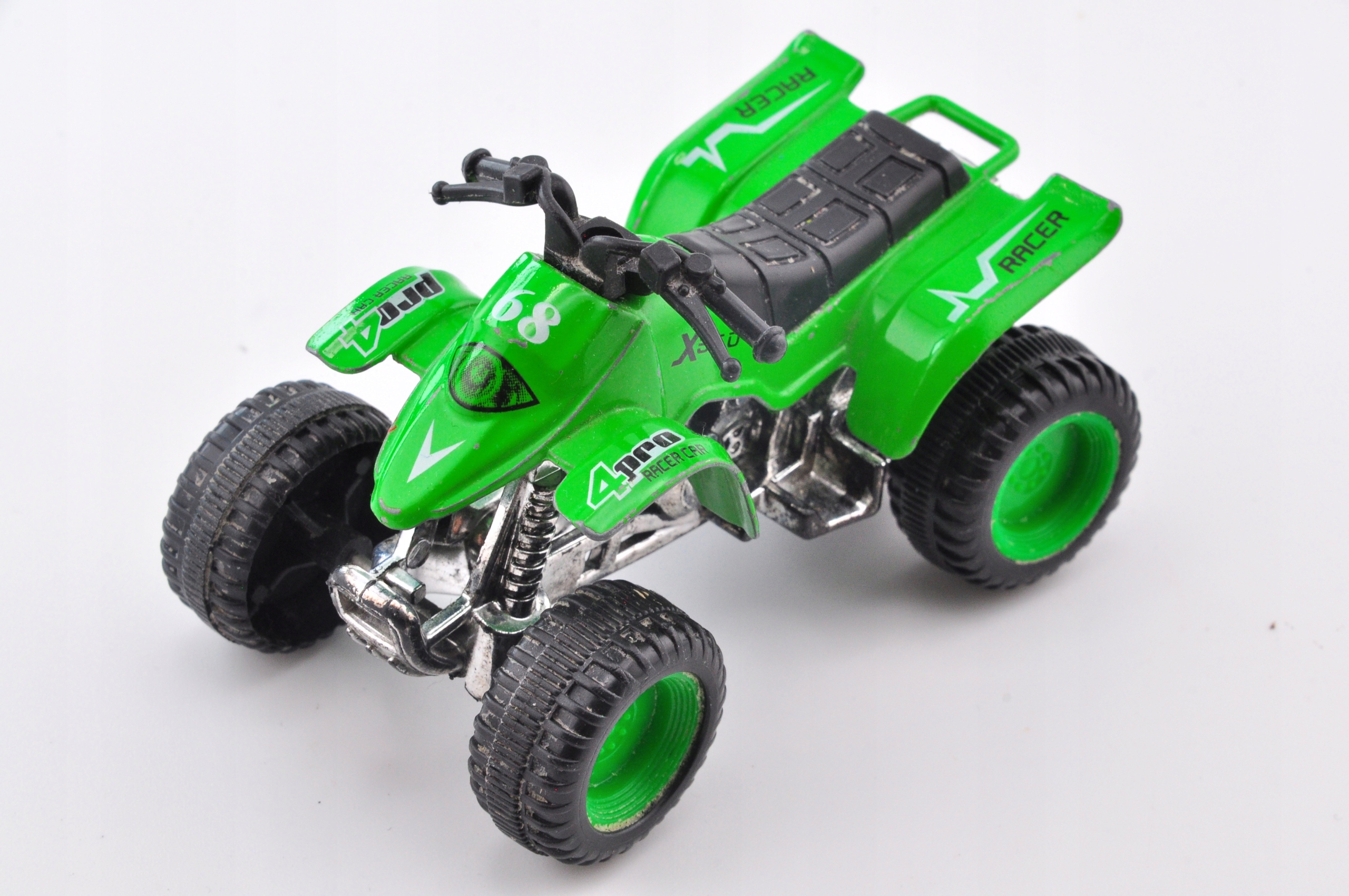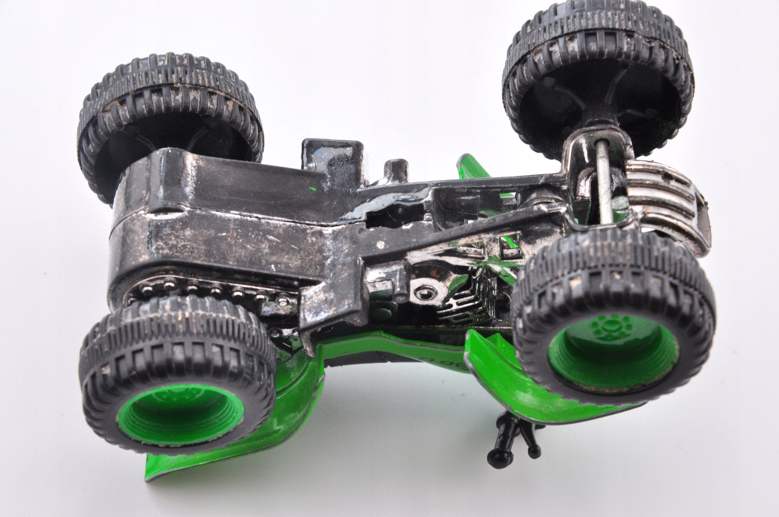 Пружина Quad Spring — модель, которая привлекает внимание своим ярким зеленым цветом с черными и серебристыми акцентами. Изготовленный из металла и пластика, он прочный и долговечный, что делает его привлекательным дополнением к любой коллекции. Большие шины и гоночные принты придают ему динамичный вид, а такие детали, как рулевое колесо и сиденье, подчеркивают его реалистичный характер. Несмотря на видимые следы эксплуатации, подвеска сохраняет свой шарм и является идеальным выбором для любителей внедорожных моделей.