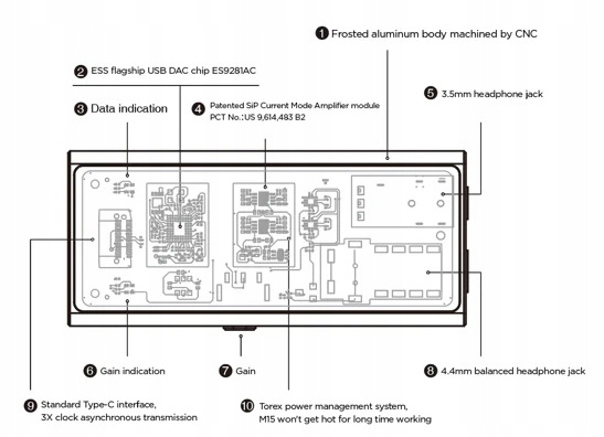 Questyle и ESS вместе с исследовательскими группами в США, Китае и Канаде поддерживают постоянное и успешное сотрудничество, чтобы превзойти ожидания клиентов в области усилителей для мобильных наушников. В M15i используется обновленный флагманский USB-ЦАП ESS ES9281AC, поддерживающий цифро-аналоговое преобразование до PCM768 и DSD512 (M15 поддерживает до PCM384 и DSD256). Характеристики искажения звука и выходная мощность также были улучшены по сравнению с предыдущим поколением.