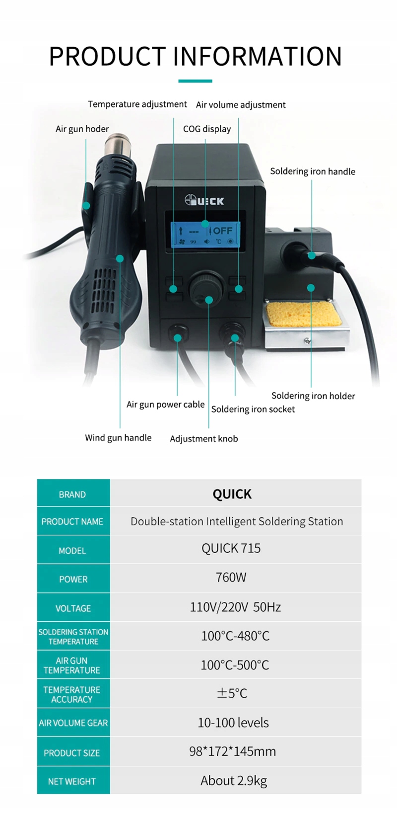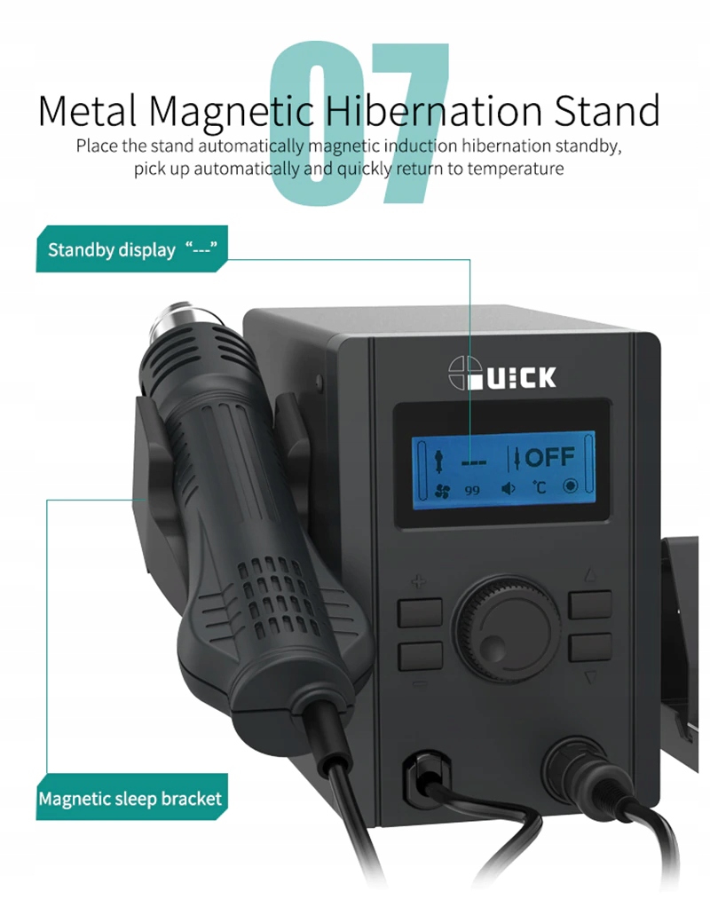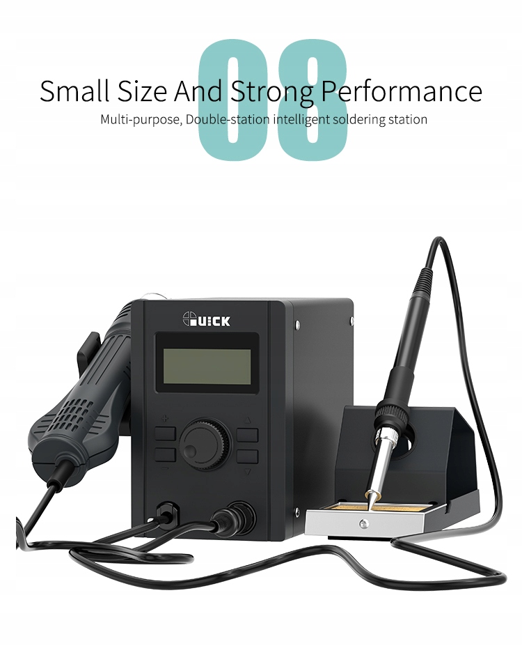 Quick 715 — это паяльная станция 2-в-1, т.е. станция для горячего воздуха (hotair) и паяльник. Благодаря двум видам нагрева устройство предназначено для пайки и распайки электронных компонентов. Он подходит как для любителей, так и для профессиональных мастерских.