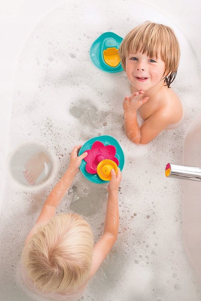 Многофункциональная форма Цветок лилии от бельгийского бренда Quut привлекает внимание оригинальным дизайном и оригинальной расцветкой. Он состоит из 4 легких элементов, которые ребенку легко держать: большого бирюзового листа, среднего розового цветка, маленького желтого глазка и прозрачной крышки. Все детали плавают на воде, а широкое дно делает их очень устойчивыми.