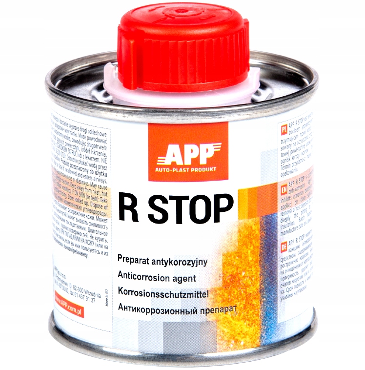 APP R Stop — антикоррозионное средство проникающего действия, останавливающее развитие коррозии. При нанесении на очищенную от ржавчины поверхность удаляет влагу из очагов коррозии (ямок) и изолирует их. Продукт готов к использованию и подготовлен к нанесению кистью или распылением. Пропитанные поверхности можно покрывать полиэфирными продуктами и 1- и 2-компонентными грунтовками. Продукт реагирует с влагой. После использования плотно закройте упаковку.