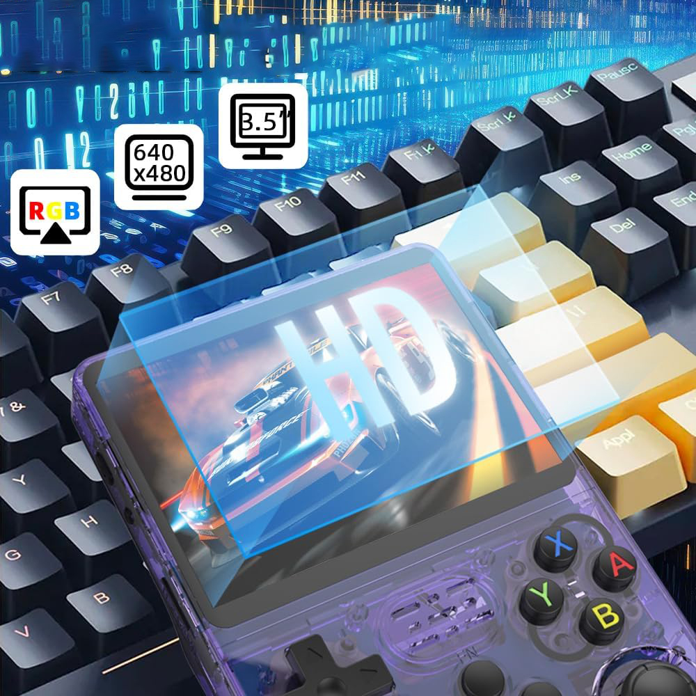 ☑ R36s имеет 3,5 -дюймовый IPS OCA Full Fit Fit HD с разрешением 640 x 480, который обеспечивает вибратные цвета и острые игровые впечатления.