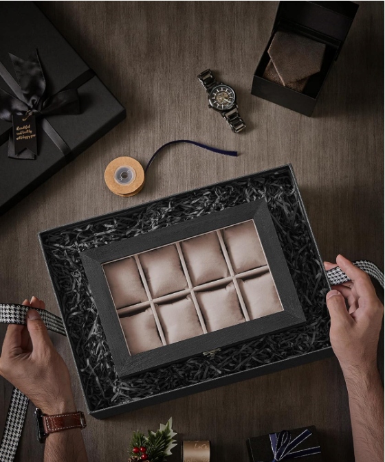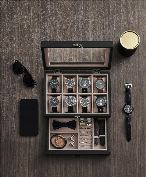 Стильная шкатулка для часов и украшений — практичное решение для людей, ценящих порядок и элегантность. Благодаря 8 отделениям для часов и дополнительному нижнему ящику для колец и браслетов все находится на своем месте и всегда под рукой.
