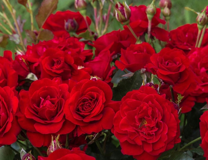Бордёрная роза многоцветковая 'Nina Weibull' с пышными кроваво-красными цветками, цветение повторяется с июня до первых заморозков. Имеет прямостоячую, кустистую форму. Подходит для посадки одиночным кустом или группами.