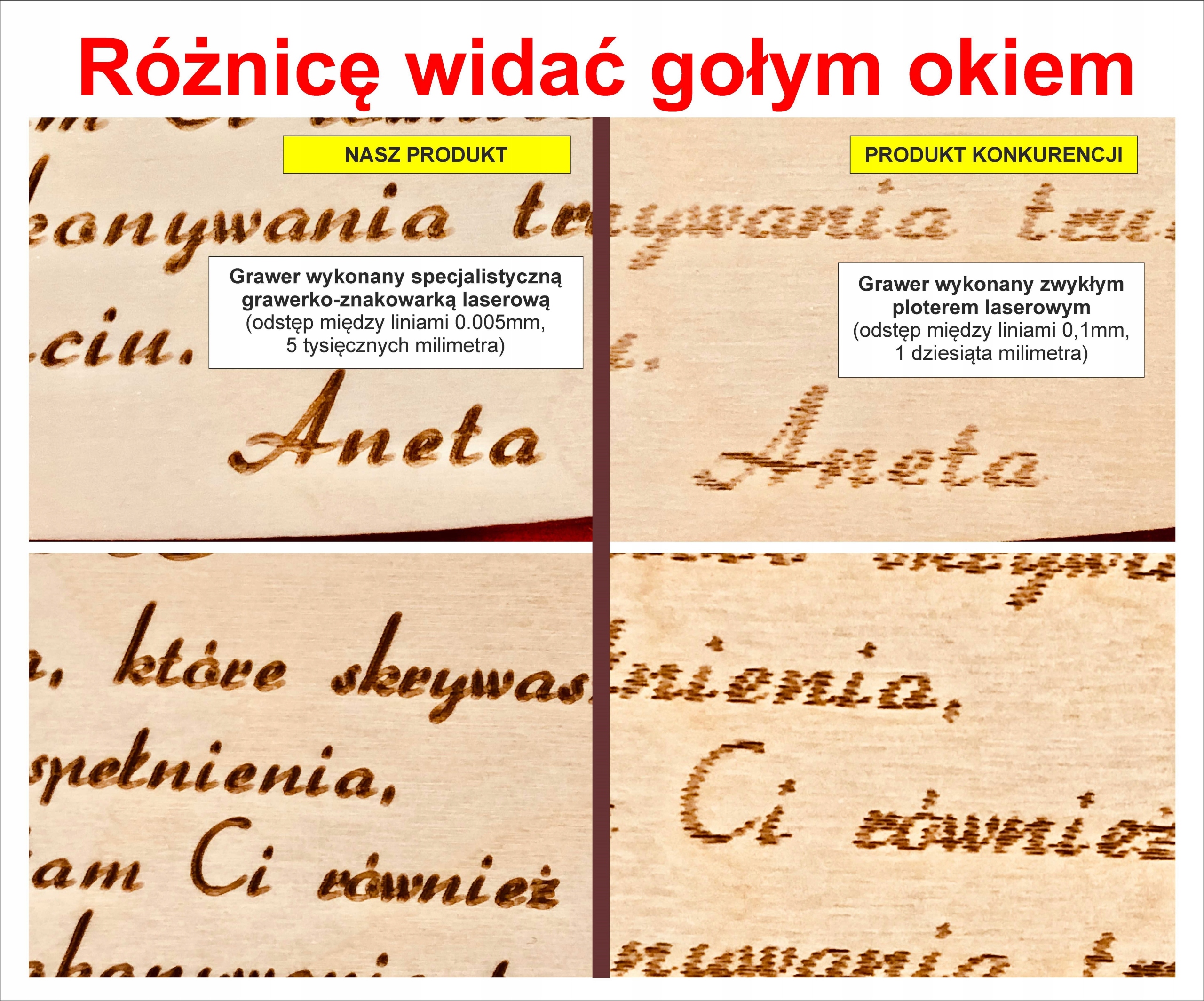 Отличие нашей продукции от продукции конкурентов представлено на фото ниже, где видна достаточно четкая разница в качестве гравировки, возникающая при гравировке лазерным плоттером и специализированным маркировочным станком, в котором шаг путь лазерного луча устанавливается равным 0,01 мм в случае гравировки фанеры, а при использовании СО2-лазерного плоттера, у которого шаг стандартен, составляет 0,2 мм, что дает в 20 раз большую точность и яркие цвета.