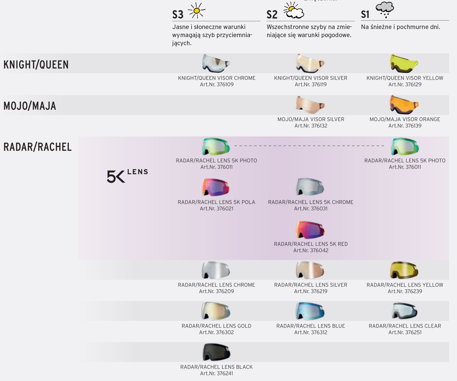Шал, совместимый со всеми радиолокационными и Рэйчел -шлемами. Он характеризуется проницаемостью высокого света, что делает его идеальным для облачных дней на склоне. Стекло поставляется в 3 размера, которые соответствуют размеру шлемов.