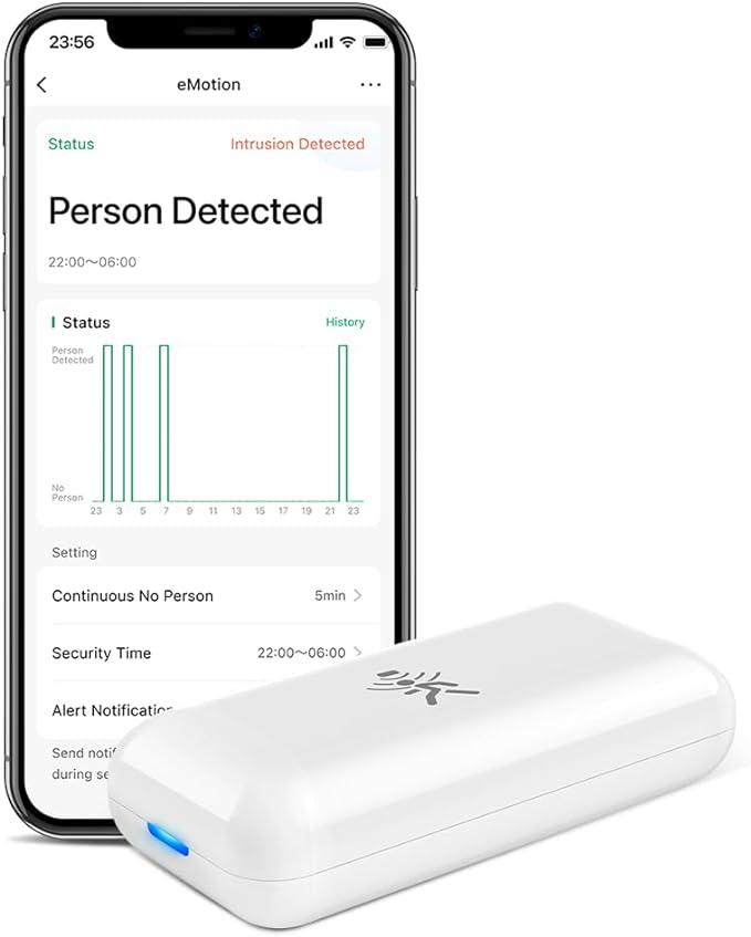 - Широкий Сигнал обнаружения барьера: eMotion можно установить в любом направлении или разместить в любом месте комнаты, даже в шкафу, и при этом точно обнаруживать движение человека, обеспечивая непревзойденную гибкость установки. (максимальное расстояние обнаружения спереди — 8 метров)