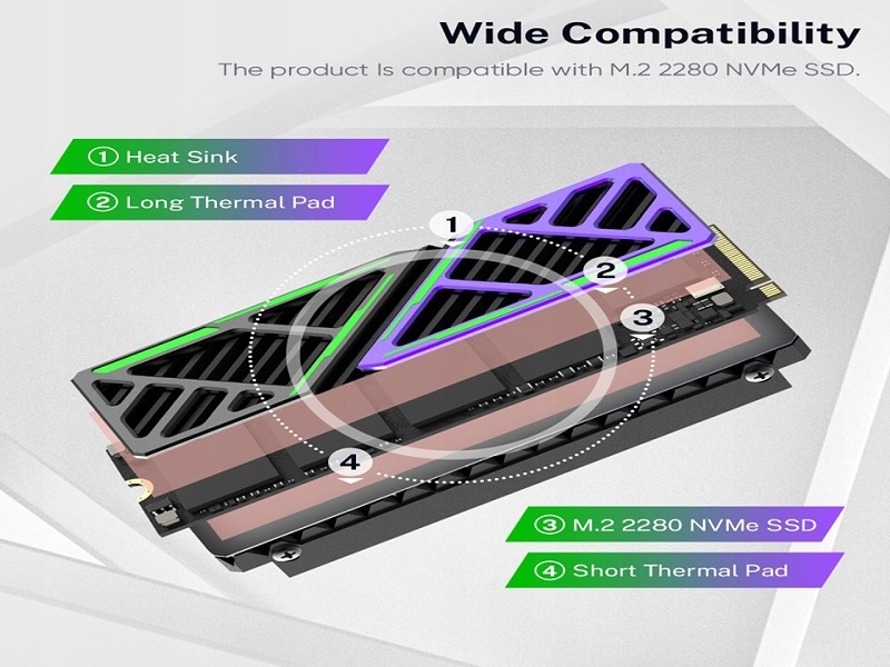 Радиатор SSD-накопителя M.2 полностью совместим с M.2. 2 NVMe шириной 20 мм и 80 миллиметров, которые оснащены системами памяти, размещенными на одной стороне. В конструкции такого типа радиатор работает лучше всего, и приводы достигают полной эффективности. .