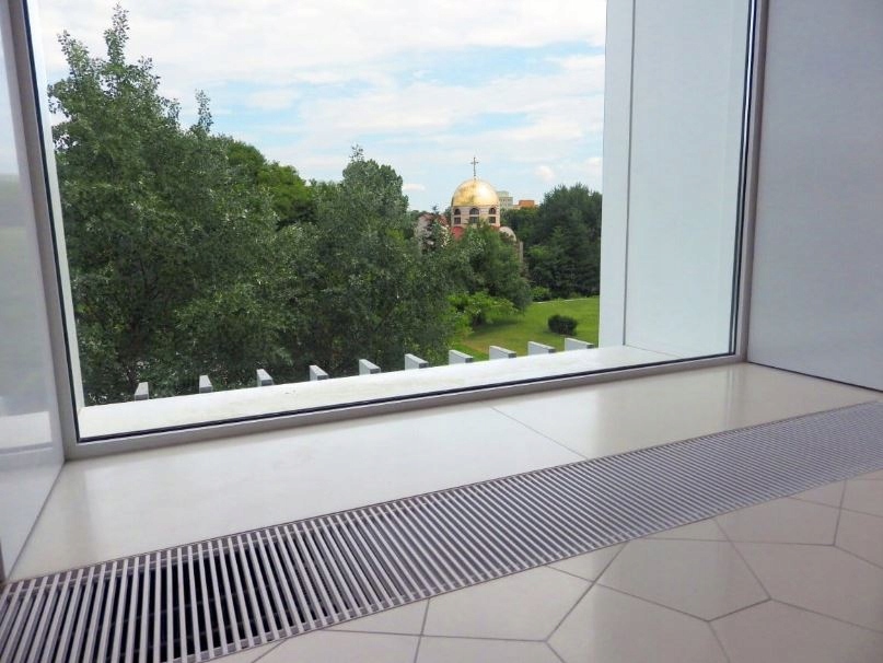 Радиаторы, размещенные в канале теплого пола, не ограничивают пространство, являются отличным решением для обогрева спортивных сооружений, религиозных и исторических зданий, коммерческих помещений, выставочных залов, автосалонов и других, где, помимо функции обогрева, важной задачей является обеспечение постоянной хорошей видимости при проведении выставок. окна.