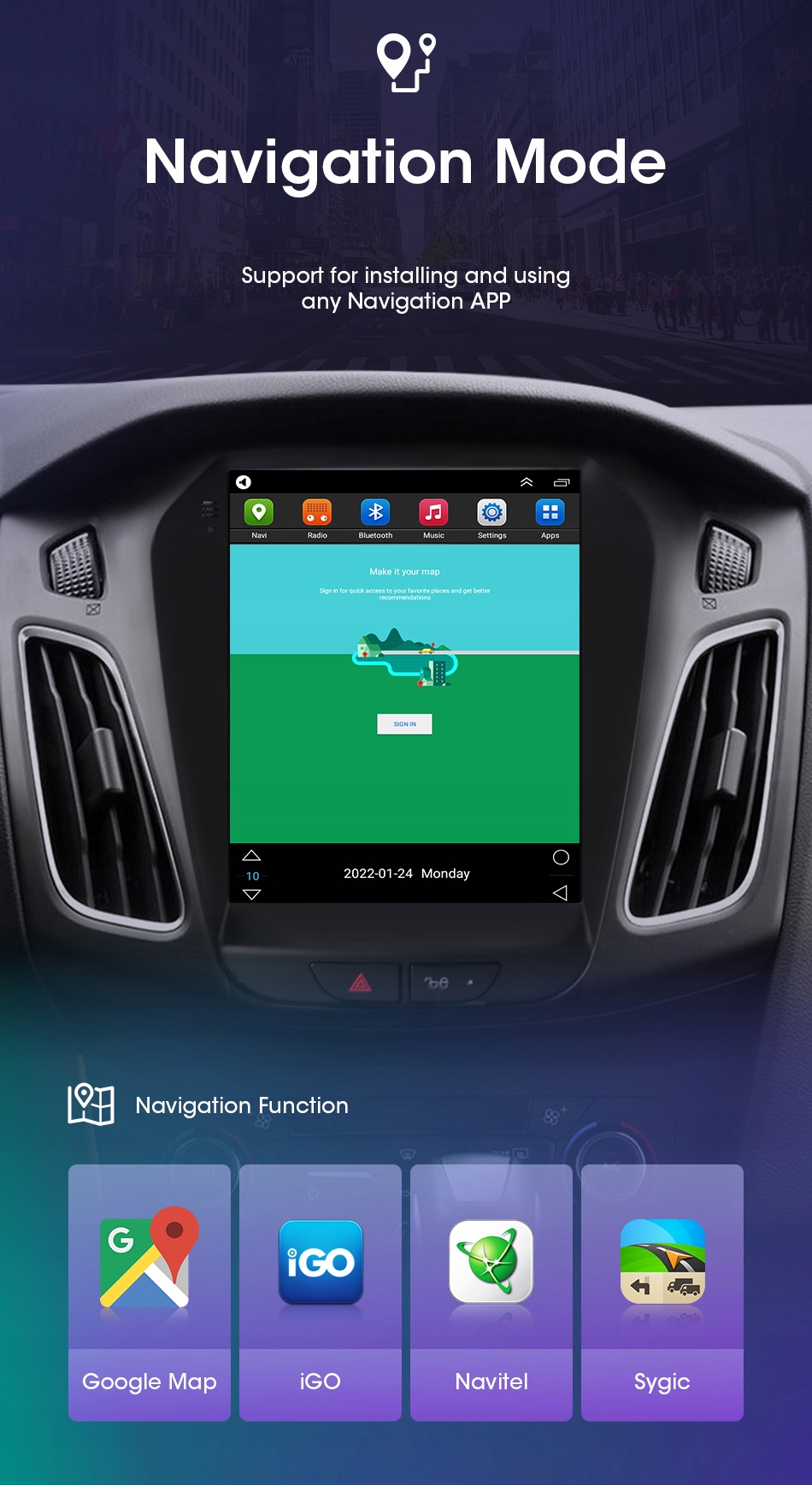 Радиостанцияможет использовать GPS-навигацию. В комплект входит «GPS-модуль». На магнитоле можно использовать несколько навигационных программ. Вы можете легко перемещаться по Польше или миру.
