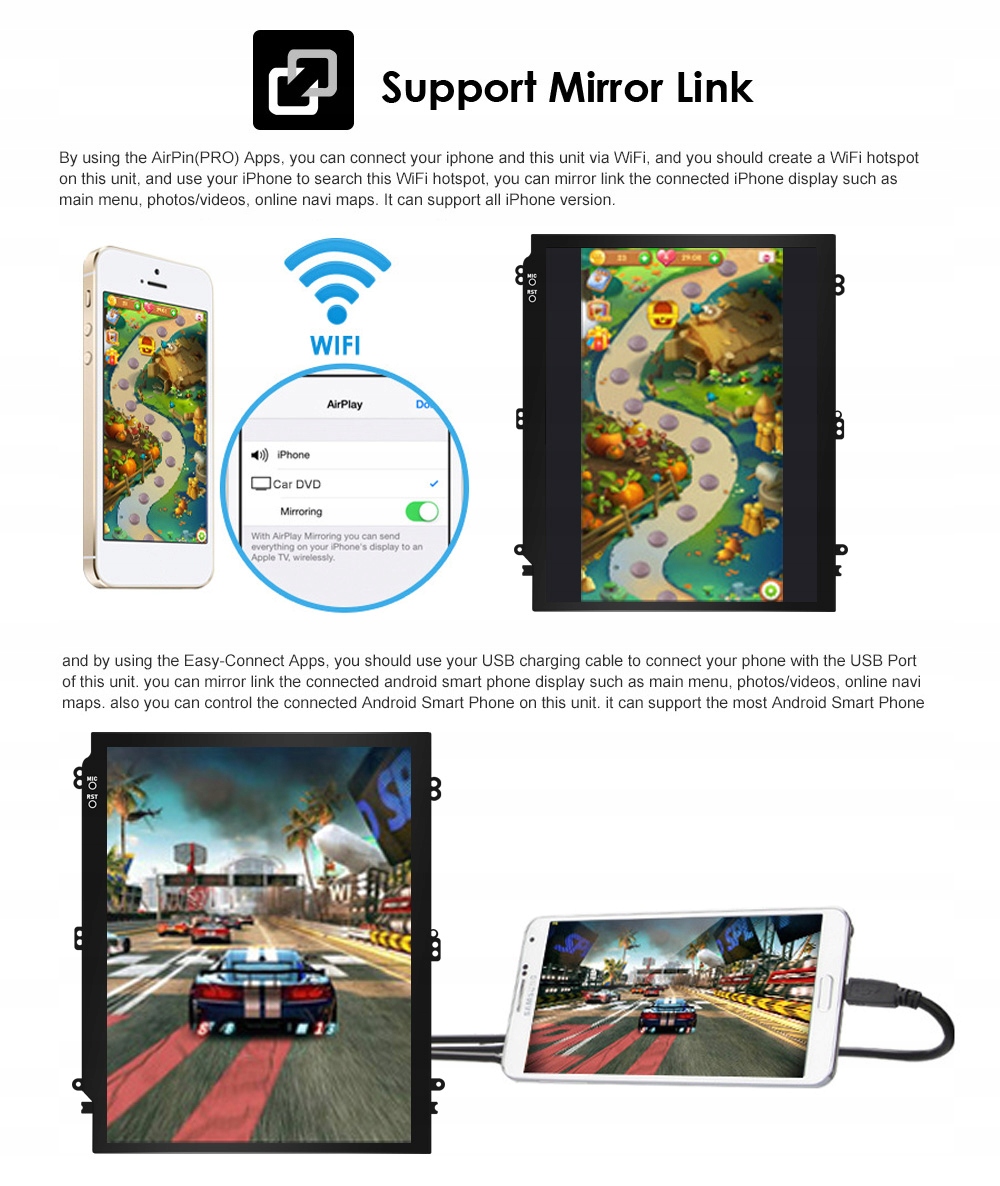 Технология, благодаря которой можно отобразить изображение телефона на экране магнитолы . В случае телефонов с ОС Android для использования этой функции подключите телефон к магнитоле через USB-кабель (не каждый телефон поддерживает функцию Mirror Link). iPhone с iOS подключается к радио через Wi-Fi.