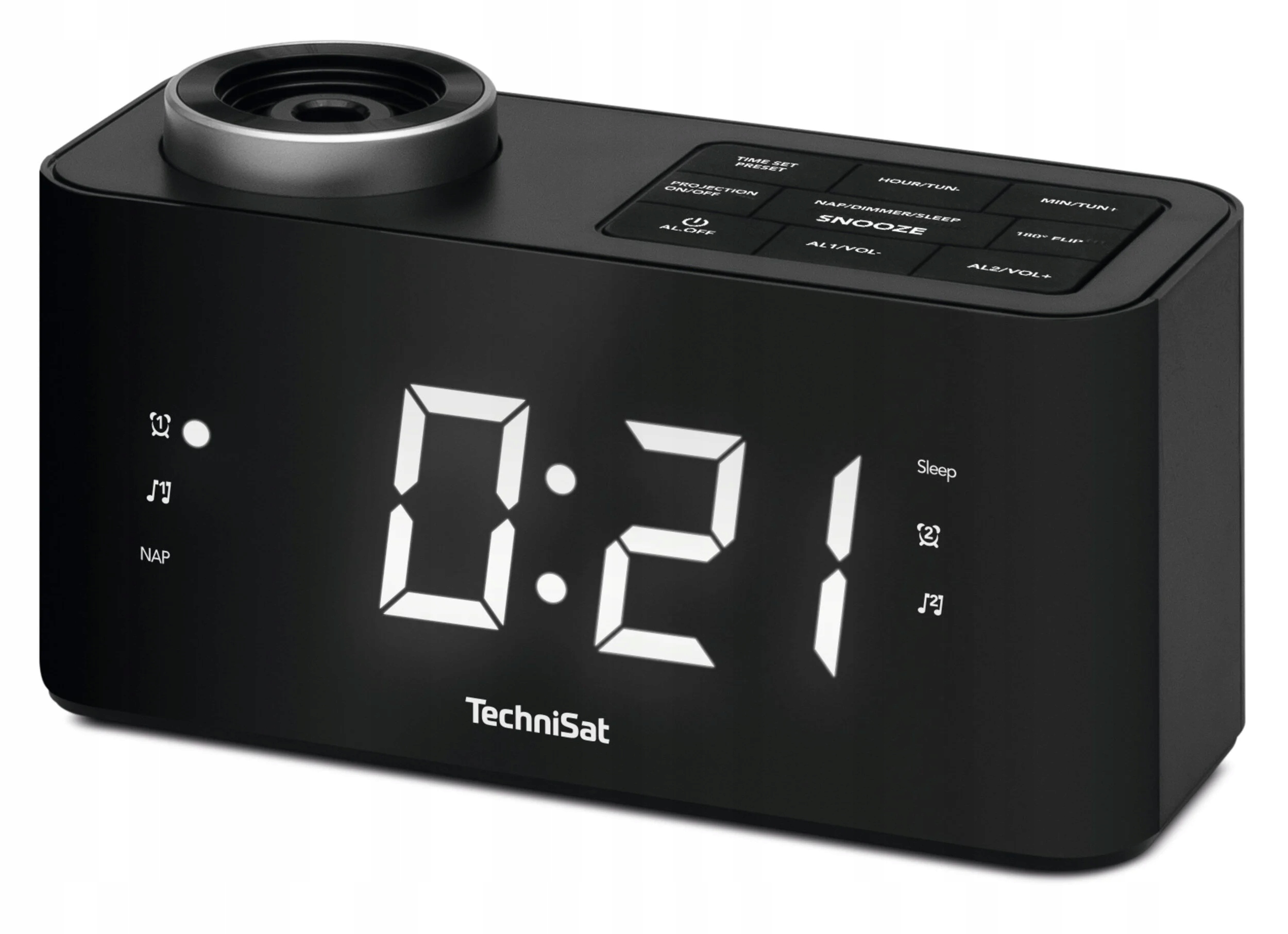 radiobudzik Technysat Digiclock 300 отличается элегантным внешним видом и функциональностью, идеально подходящей для каждой спальни. Благодаря созданному проектору вы можете удобно прочитать час от потолка, и функция FLIP позволяет вращать отображаемое изображение на 180 °. Устройство предлагает настройку двух независимой сигнализации , функции NAP и память о 10 радиостанциях FM . Яркость 1,2-дюймового светодиодного дисплея может быть отрегулирована при двух градусах . Radiobudzik питается из сети , а дополнительные батареи (2x AAA) используются для для поддержания памяти настроек в отсутствие тока.