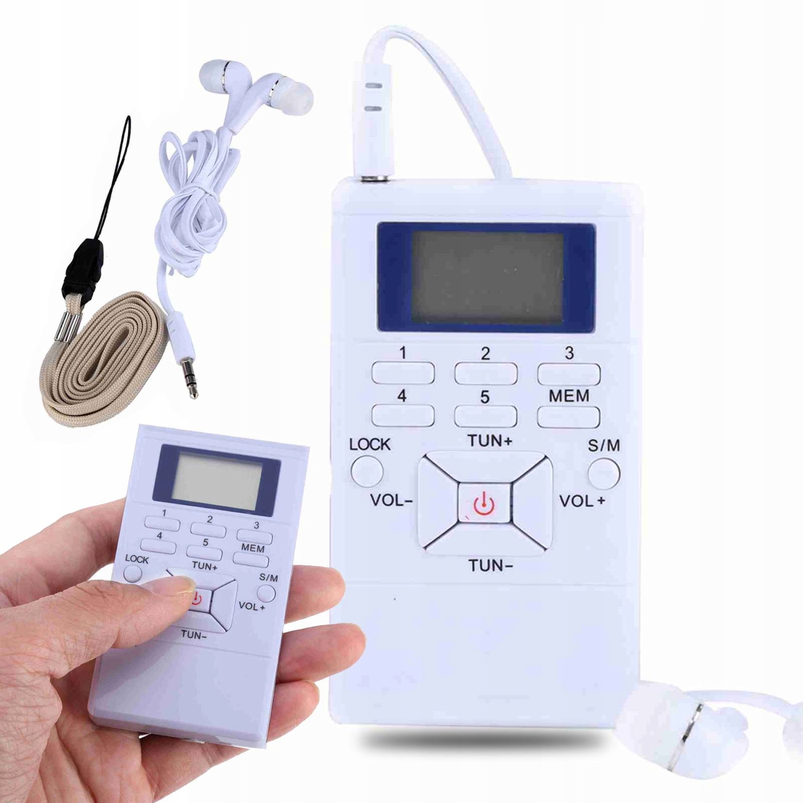 Mini Portable FM LCD -радио цифровой цифровой сигнал. Обработка беспроводного приемника с белыми наушниками