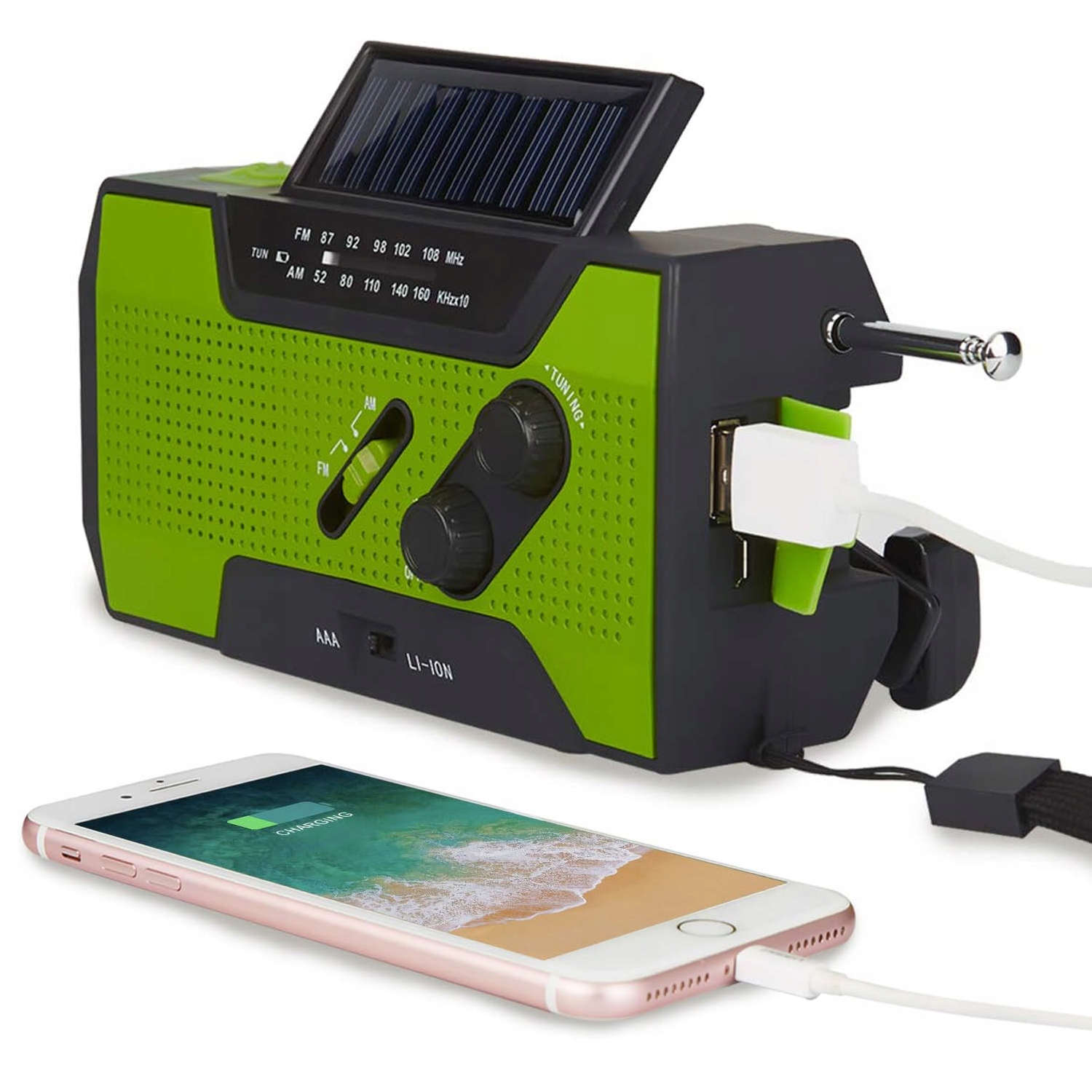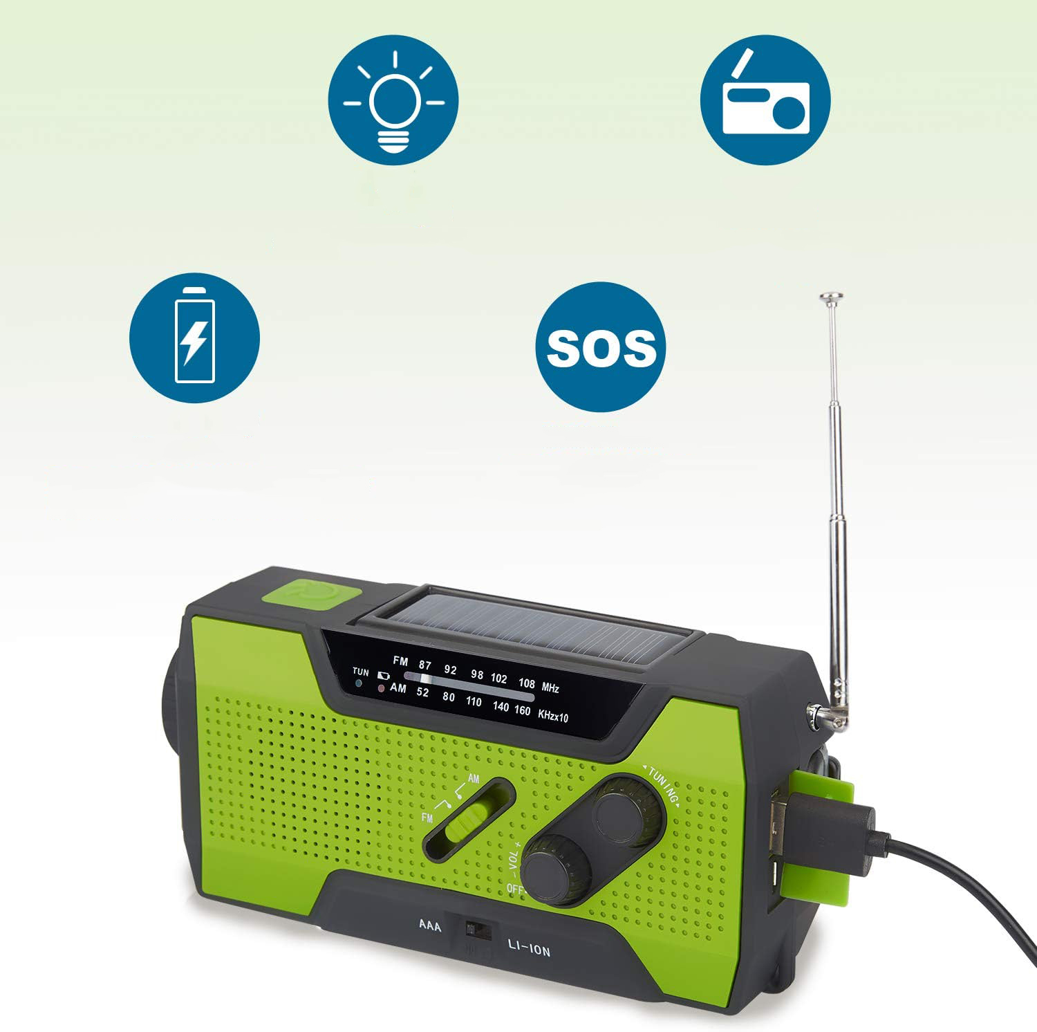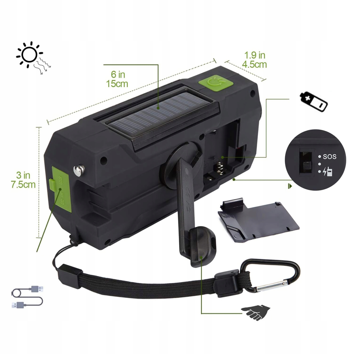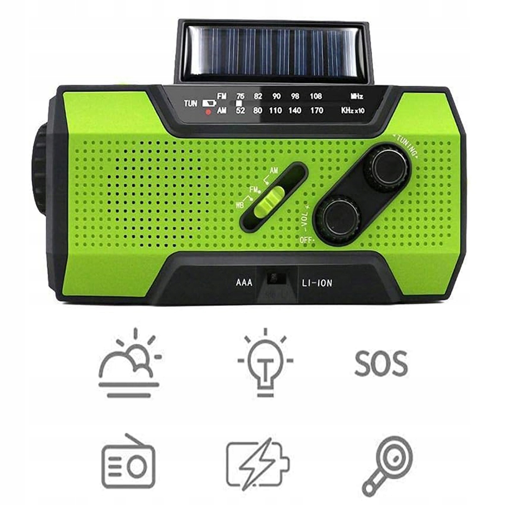 Радио • Фонарик • SOS-сигнализация • Powerbank • Солнечная и ручная подача питания