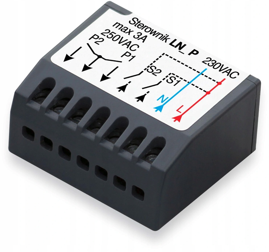 LN-P — универсальный сетевой радиоконтроллер с питанием от сети переменного тока 230 В, с 2 каналами реле с нагрузочной способностью 3 А/230 В. Контроллер LN-P можно использовать, например, для управления приводом ворот, у которого нет аксессуаров для питания с выходом 24 В. LN-P имеет выходы S1 и S2, к которым можно подключить кнопки настенного звонка.