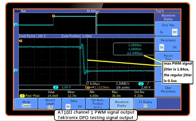 Джайтер сигнала максимального ширина составляет 1,84уса, обычный джиттер составляет 0,5US Tektronix DPO.