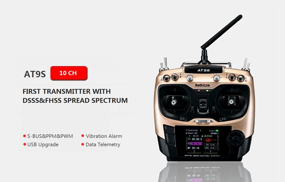 Аппарат AT9S оснащен системой DSSS (спектр прямого распределения последовательности) и поддерживает эффективную и устойчивую к модуляции QPSK для нарушения (Kedrature Fase Shifting) благодаря которой он обеспечивает лучшую производительность и стабильную контроль для дальних управляющих расстояний. Стабильный диапазон выше 900 м на Земле 1 и 3400 м в воздухе.