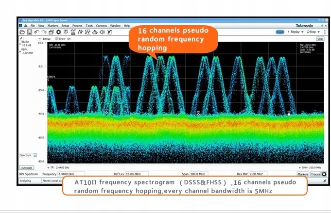 Синхронная работа DSS и FHSS. AT 1011 имеет 16 каналов со скачкообразной перестройкой частоты. QPSK прекрасно обеспечивает защиту от помех. Отлично подходит для контроля устойчивости в городских условиях.
