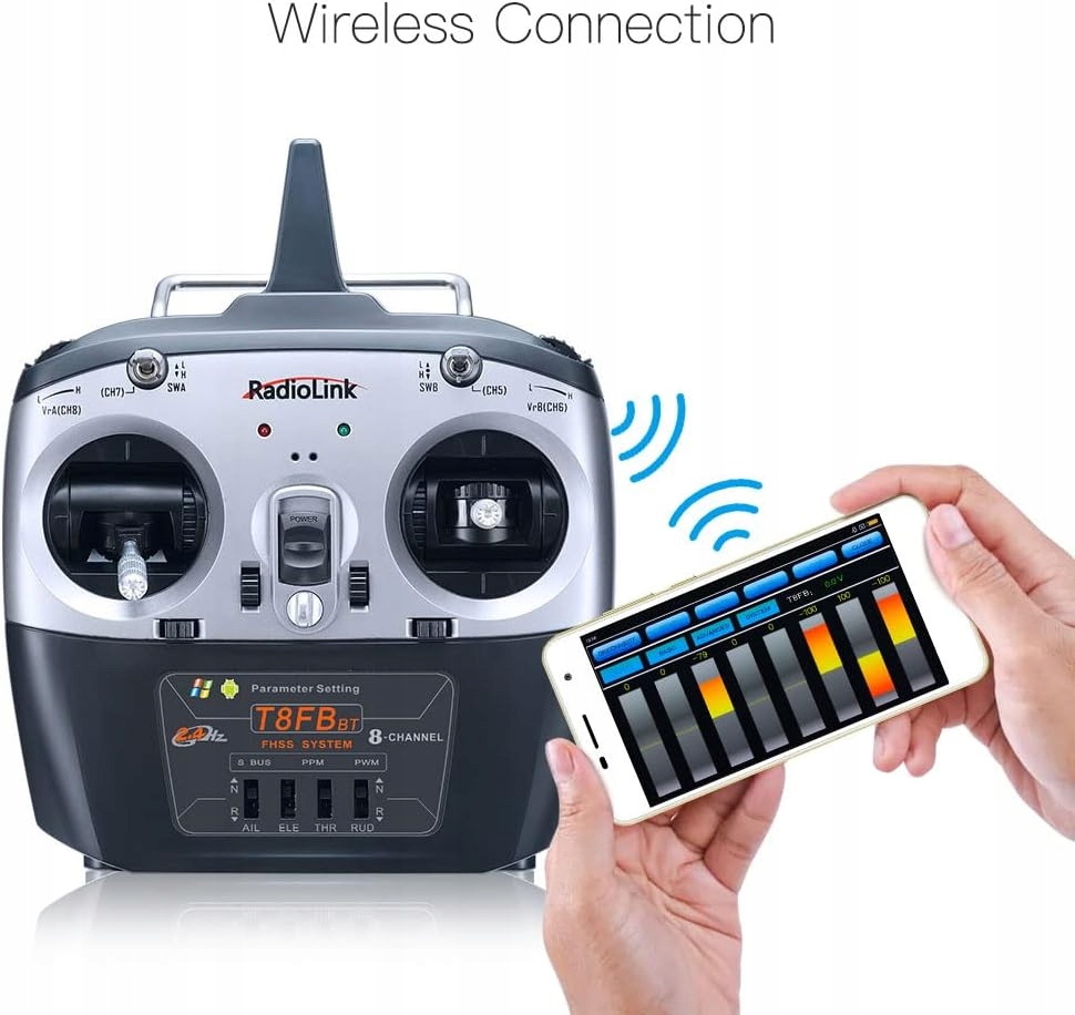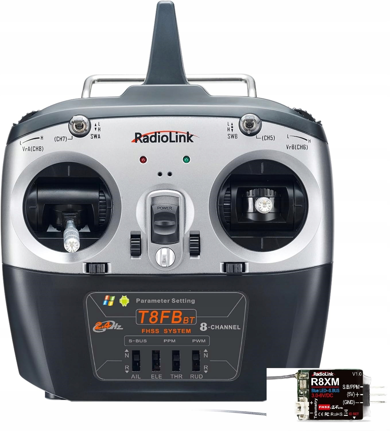 Последняя версия устройства RadioLinkT8FB 8CH — отличное предложение для начинающих и продвинутых пользователей, как с точки зрения функциональности, так и уровня подготовки пользователя. Программное обеспечение оборудования позволяет управлять вертолетами, планерами и дронами. T8FB может обновлять программное обеспечение через ПК, также имеется приложение Android для управления и настройки. Устройство совместимо с портом S-BUS, а также обеспечивает одновременную связь через PPM и PWM. В комплект входит 8-канальный приемник R8-EF.